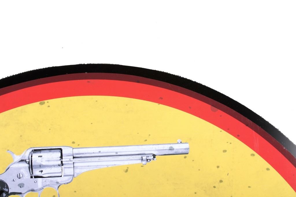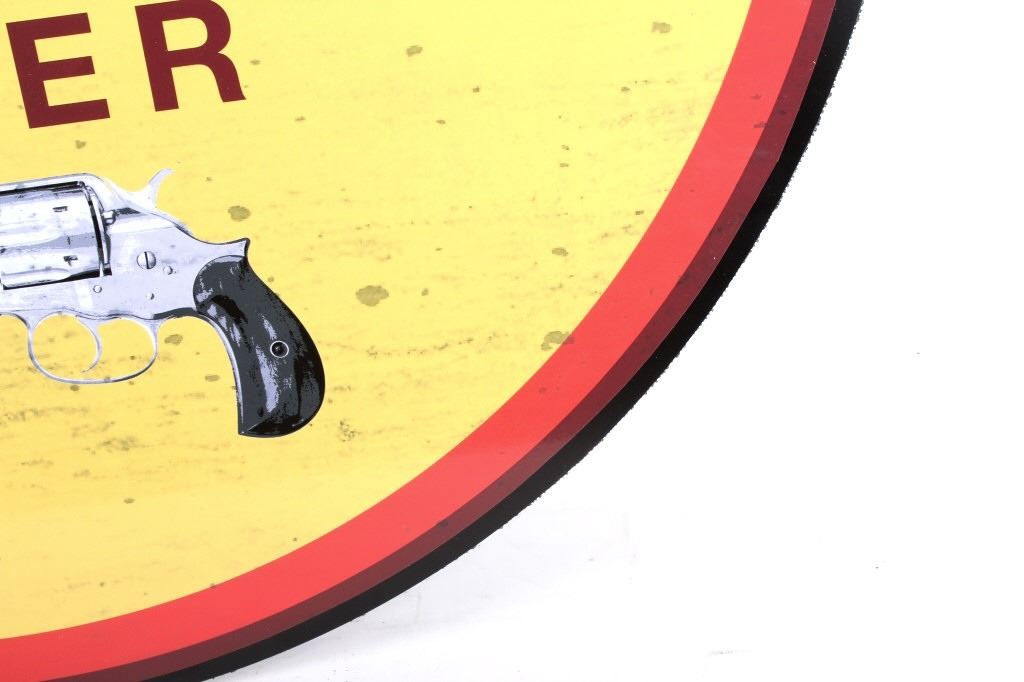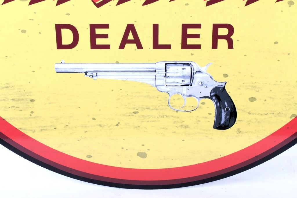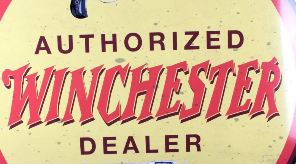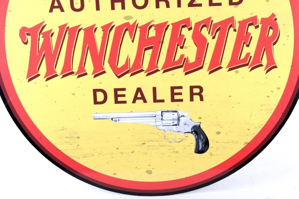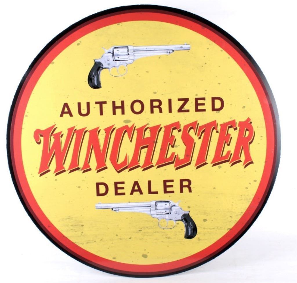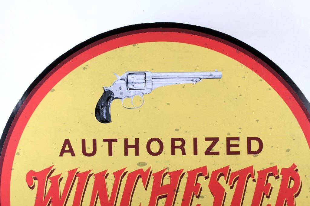 For sale in this lot we have a Winchester authorized dealer advertising sign. The sign shows bright color, and sharp graphics on this single sided advertising sign. It also features two model 1883 prototype revolvers across the face of the sign. This modern sign reads "Authorized Winchester Dealer" across the front of the piece. The sign is in good condition overall with some discoloration on the front. It measures 35" in diameter.