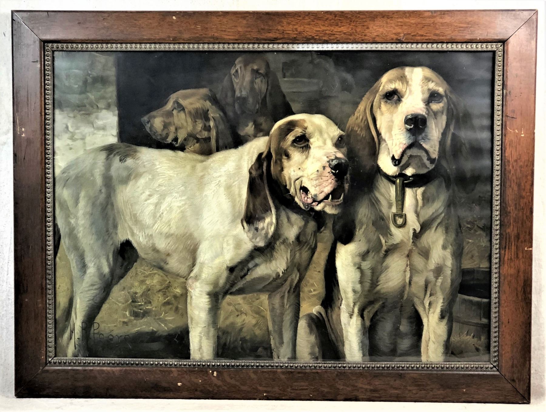 Henry R. Poore Lithograph, (American, 1859-1940) "Bear Dogs," an early Winchester advertisement, four hunting dogs. Image measures 25 1/2" x 36", signed on the stone lower left. In a period wood frame.