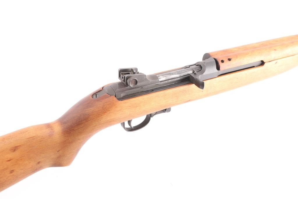 SN: 6492223. US military semi-automatic rifle manufactured circa 1944. Features parkerized finish, walnut stock & handguard, protected blade front sight, peep rear sight with sliding elevator, 18" barrel, rotary safety, front sling swivel, Type III front band with bayonet lug, oval cut sling/oiler slot in butt, accepts detachable magazine. Round bolt, four rivet handguard. Correct Type III low wood birch stock with oval cut, Winchester trade mark on barrel. Bore is very good condition. Retains most of the parkerized finish, some edge loss of finish, friction loss on the bolt. Wood is sound, appears to have been lightly sanded. Importer marks found on the left barrel, Blue Sky, Arlington, VA. No Magazine. USGI green canvas sling attached. Probably sent to South Korea, South Vietnam, or France, and imported back to the U.S.
