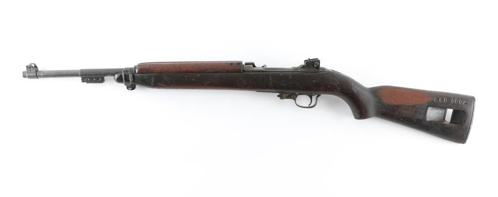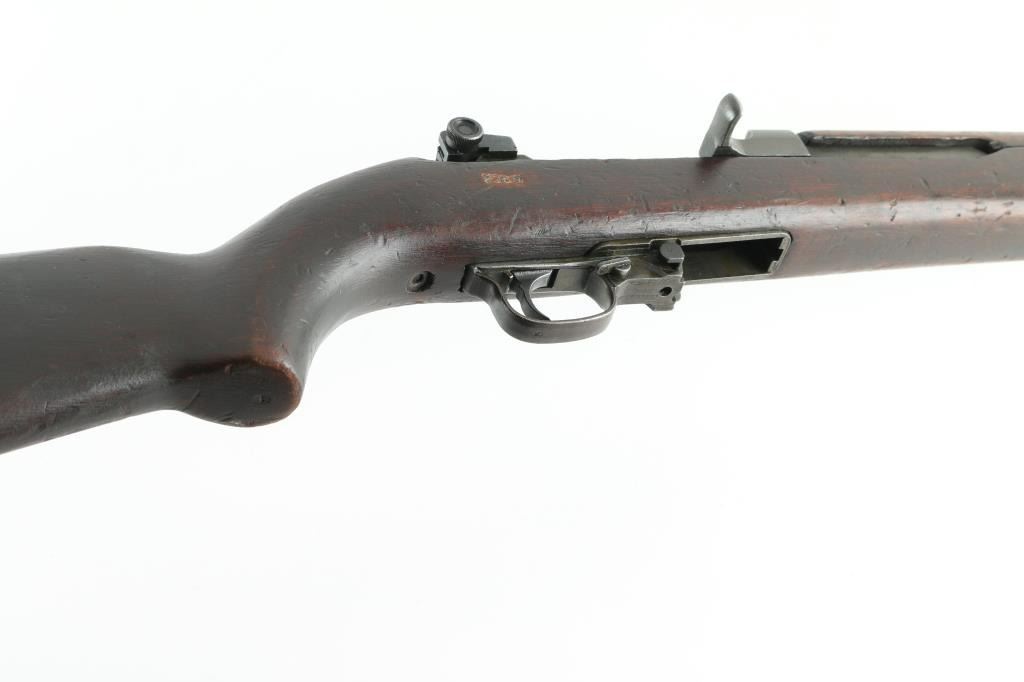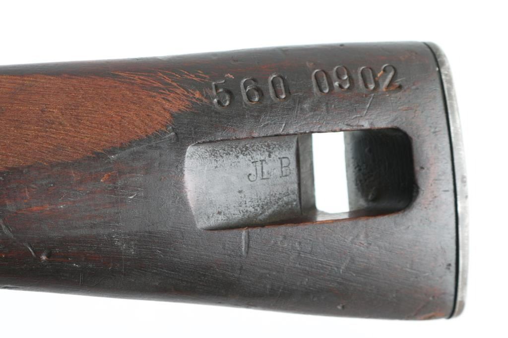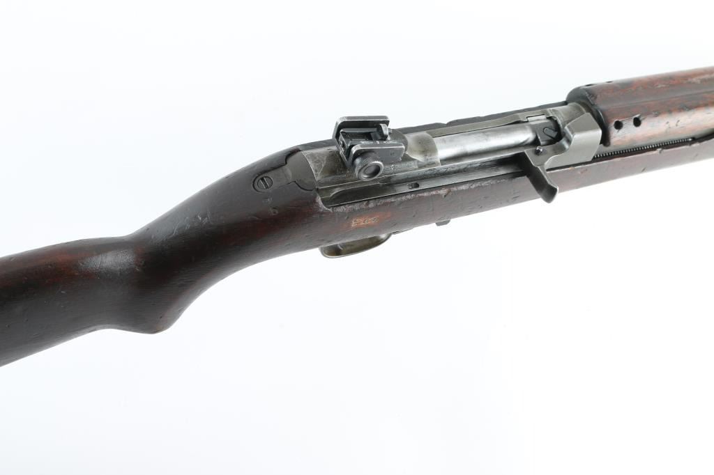 SN: 56600902 US military semiautomatic rifle . Features Parkerized/blued finish, walnut stock & handguard, protected blade front sight, peep rear sight with sliding elevator, 18" barrel, push button manual safety, front sling swivel, wide front band with bayonet lug, sling slot in butt, accepts detachable magazine. Round top bolt, four rivet handguard. "W" marked barrel, no date. "SG" on tang. "P" proof on grip. "RA" on right buttstock, and "200" on right stock above trigger. "5600902" stamped on left buttstock."JLB" marked in sling slot (IBM) Bore is very good condition. Metal has handling wear, friction wear on bolt. Wood is poor with numerous ding/dents/scratches. Also there is a large (4"x2") abrasion to the left buttstock. This carbine has seen very hard use, I believe in South Korea, thus the CAI import marks on the underside of barrel. Could be upgraded with new wood. NRA Condition-Fair to Good. C&R firearm