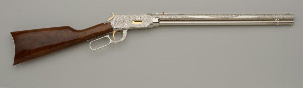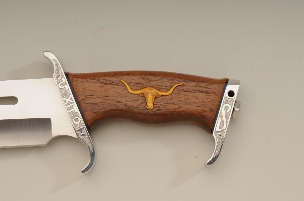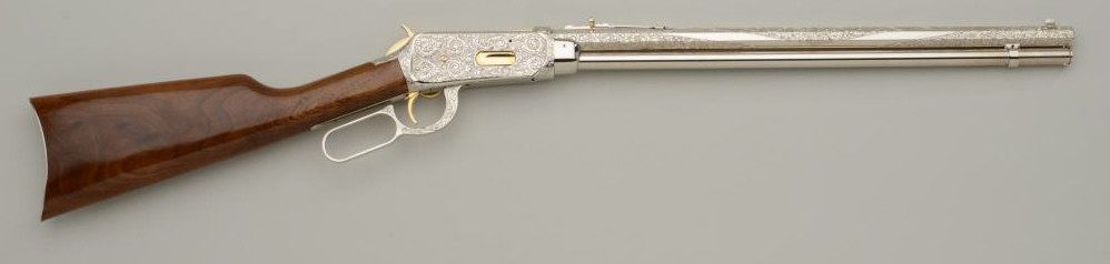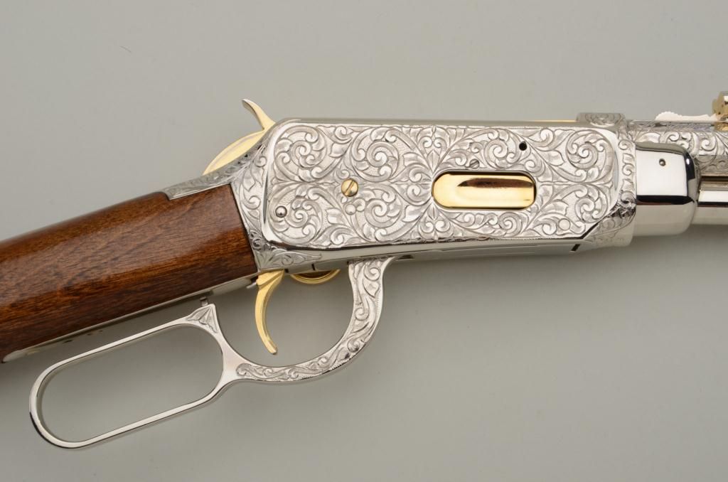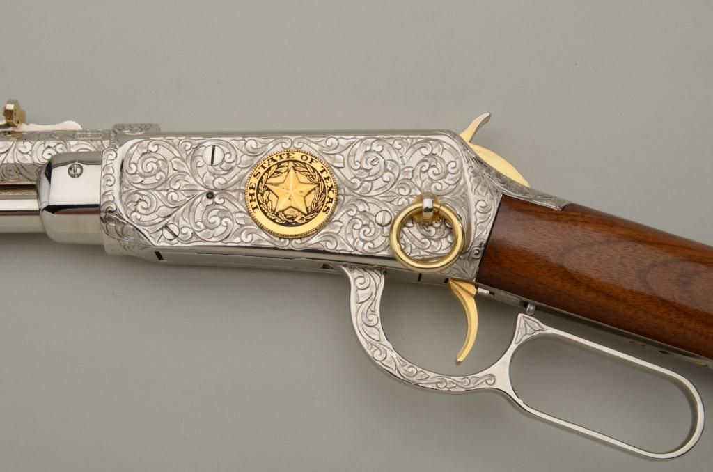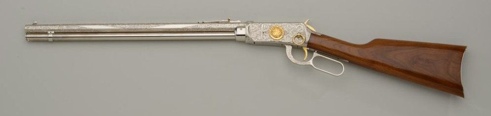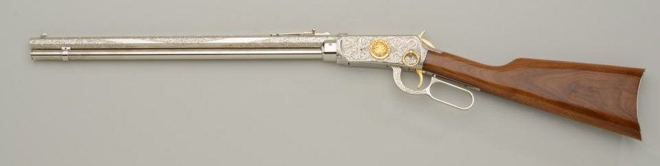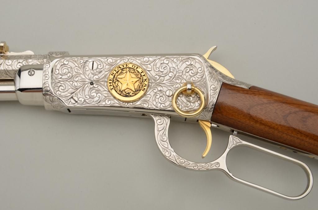 Winchester Centennial ’66 lever action rifle “A Century of Leadership”, customized and finely engraved by noted artist Phil Hudson, .30-30 cal., 20” octagon barrel, nickel finish with gold accented hammer, trigger,loading port, screw heads, saddle ring and rear sight parts, raised gold State of Texas seal on left side of receiver, wood butt stock, #61828. This gun is in fine condition showing extensive scroll engraving on thereceiver, barrel and lever, 99% + re-nickeled finish remaining, fine bore, action and wood butt stock; fore stock removed as part of customization. Accompanying this piece is a huge custom Bowie knife with cattle brands on the cross guard and pommel and wood grip with raised carved long horn steer head on the left side of the grip finely accomplished; the knife is approx. 16” overall with an 11” blade in like newcondition; a truly outstanding set for prominent display in the gunroom. From the Texas collection of Eddie Glover, Jr. Est.: $1,500-$3,000.