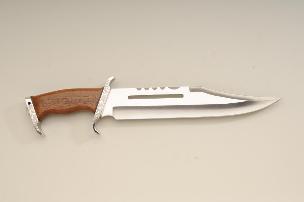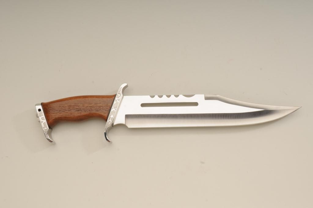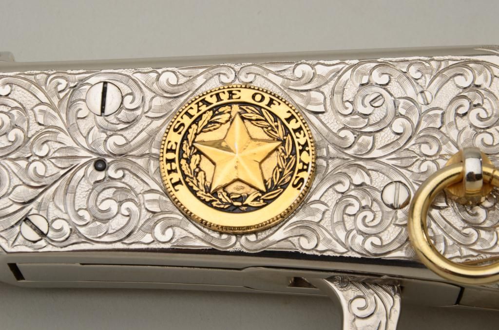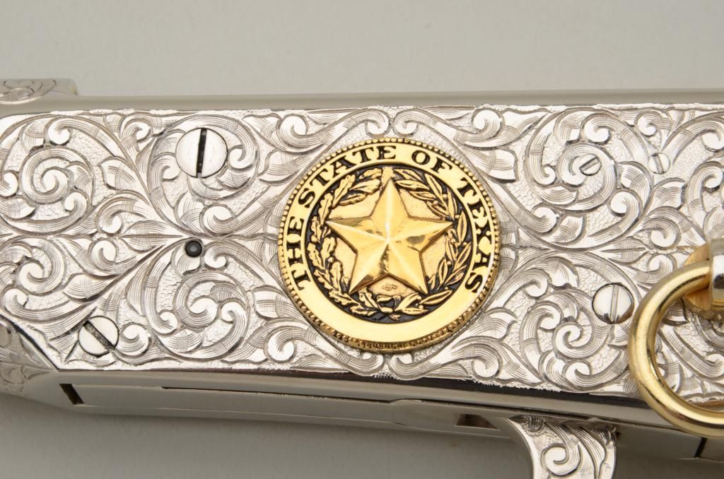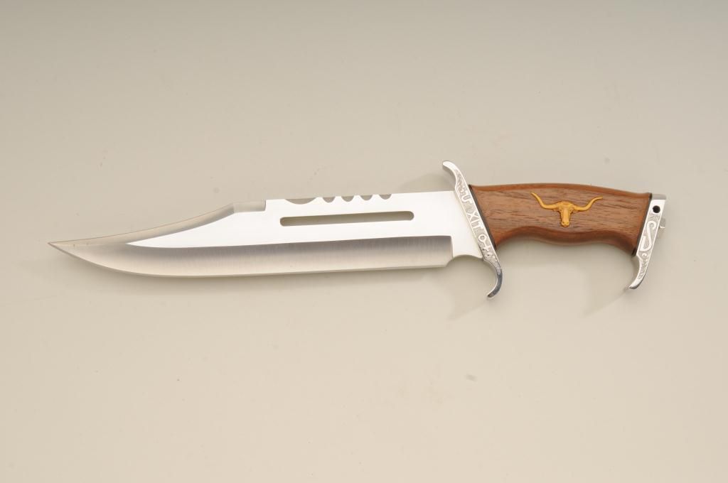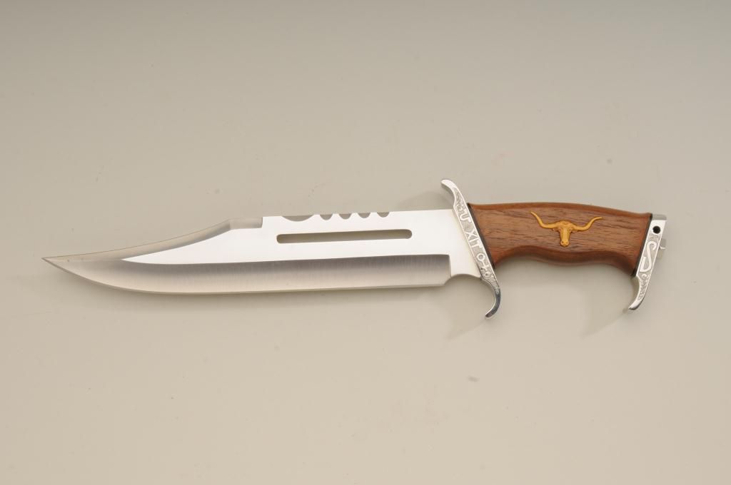 Winchester Centennial ’66 lever action rifle “A Century of Leadership”, customized and finely engraved by noted artist Phil Hudson, .30-30 cal., 20” octagon barrel, nickel finish with gold accented hammer, trigger,loading port, screw heads, saddle ring and rear sight parts, raised gold State of Texas seal on left side of receiver, wood butt stock, #61828. This gun is in fine condition showing extensive scroll engraving on thereceiver, barrel and lever, 99% + re-nickeled finish remaining, fine bore, action and wood butt stock; fore stock removed as part of customization. Accompanying this piece is a huge custom Bowie knife with cattle brands on the cross guard and pommel and wood grip with raised carved long horn steer head on the left side of the grip finely accomplished; the knife is approx. 16” overall with an 11” blade in like newcondition; a truly outstanding set for prominent display in the gunroom. From the Texas collection of Eddie Glover, Jr. Est.: $1,500-$3,000.