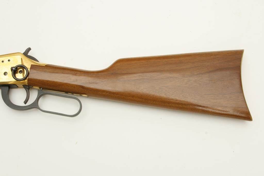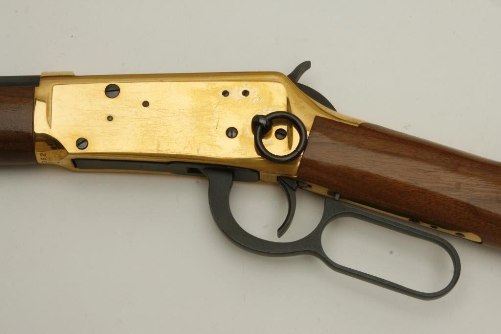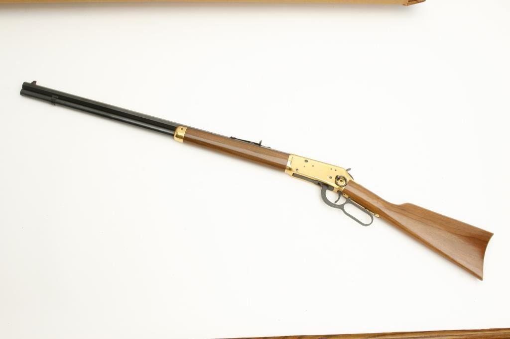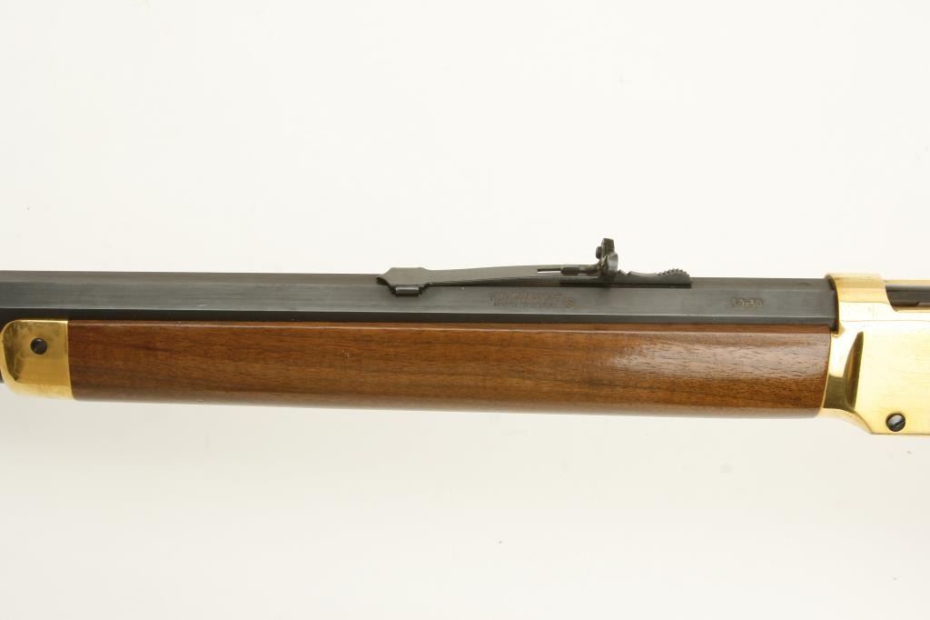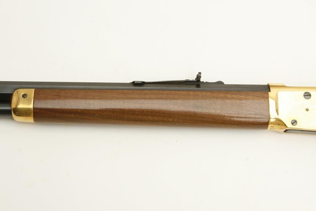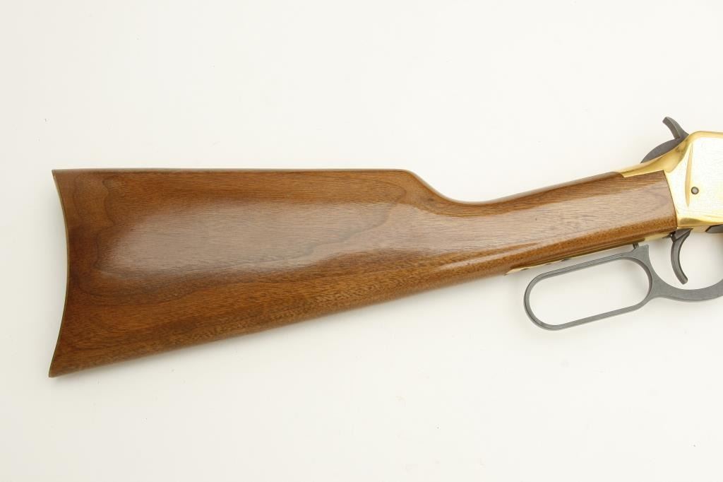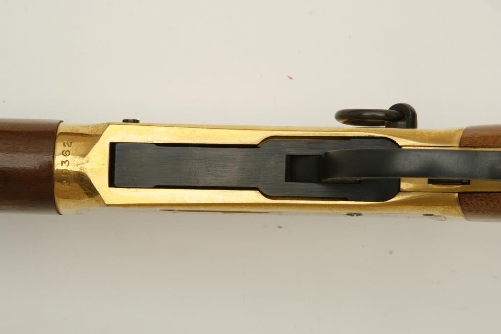 rifle, 30-30 caliber, serial #29362. The rifle is as new in the box with a 26” octagon barrel. The barrel and full-length magazine retain nearly all of their blued finish, while the receiver, fore end cap and butt plate are done in polished brass. The receiver has scuffing and light surface erosion on both sides of the receiver. The smooth wood stocks are in excellent condition showing light handling marks only. The rifle is in the original box with all associated packaging material and paperwork, with the cardboard sleeve. (Modern) Est.: $300-$600.