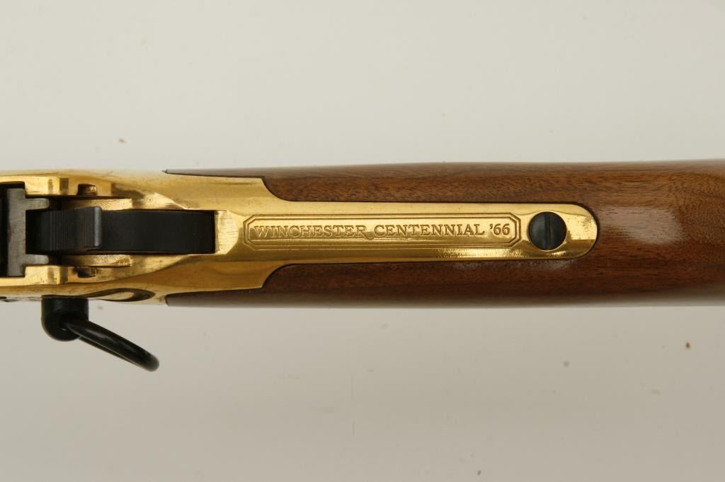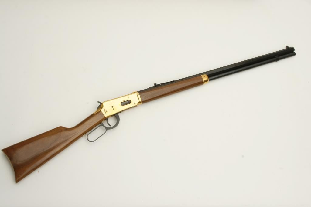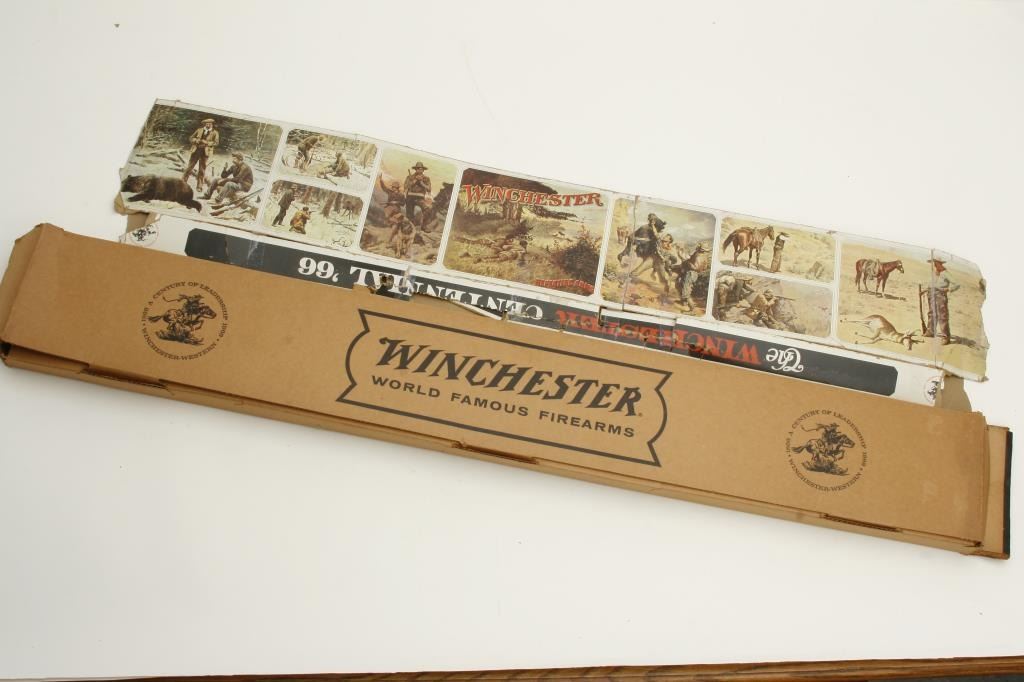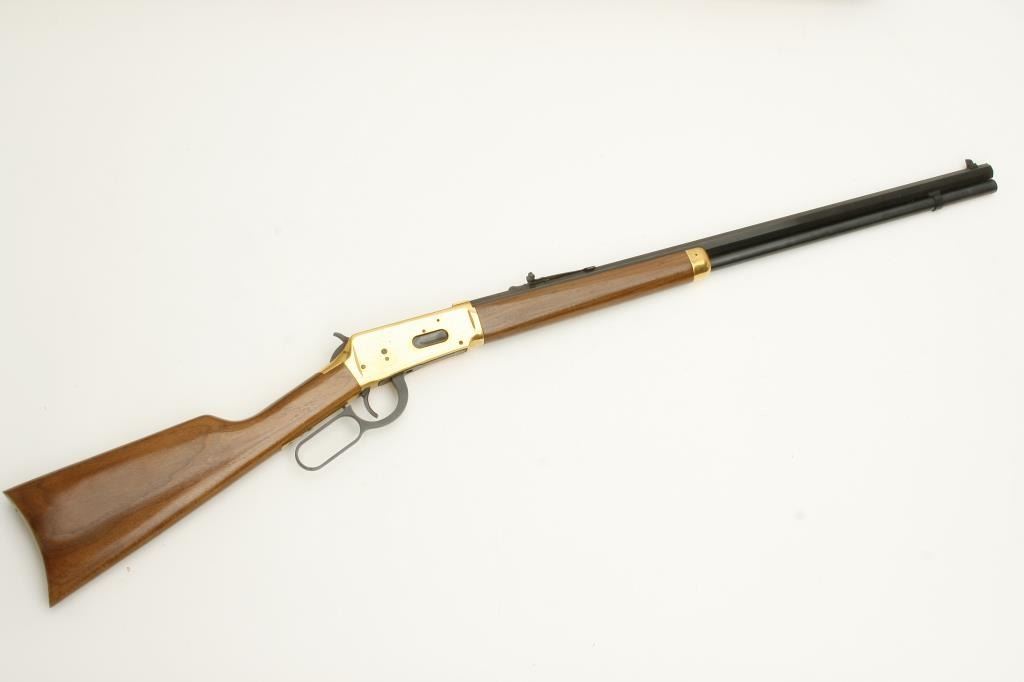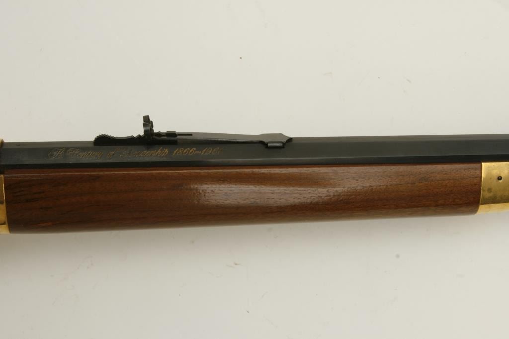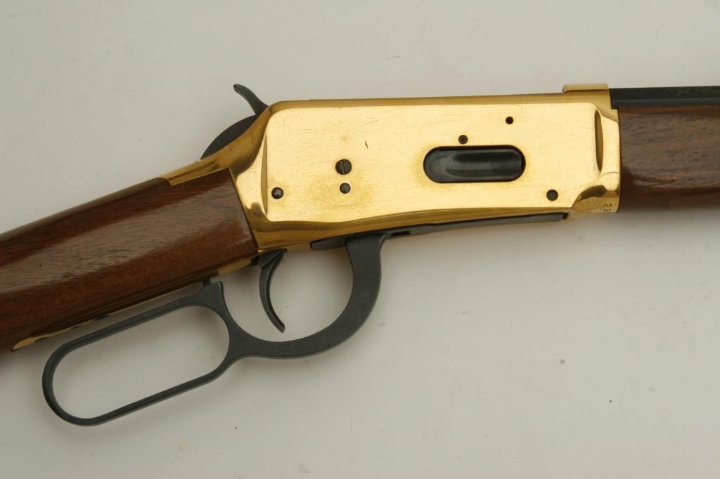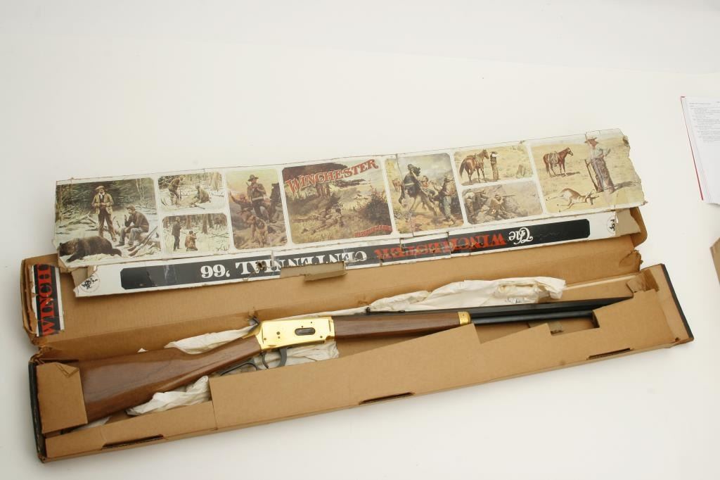 rifle, 30-30 caliber, serial #29362. The rifle is as new in the box with a 26” octagon barrel. The barrel and full-length magazine retain nearly all of their blued finish, while the receiver, fore end cap and butt plate are done in polished brass. The receiver has scuffing and light surface erosion on both sides of the receiver. The smooth wood stocks are in excellent condition showing light handling marks only. The rifle is in the original box with all associated packaging material and paperwork, with the cardboard sleeve. (Modern) Est.: $300-$600.