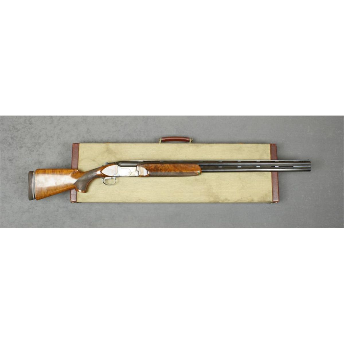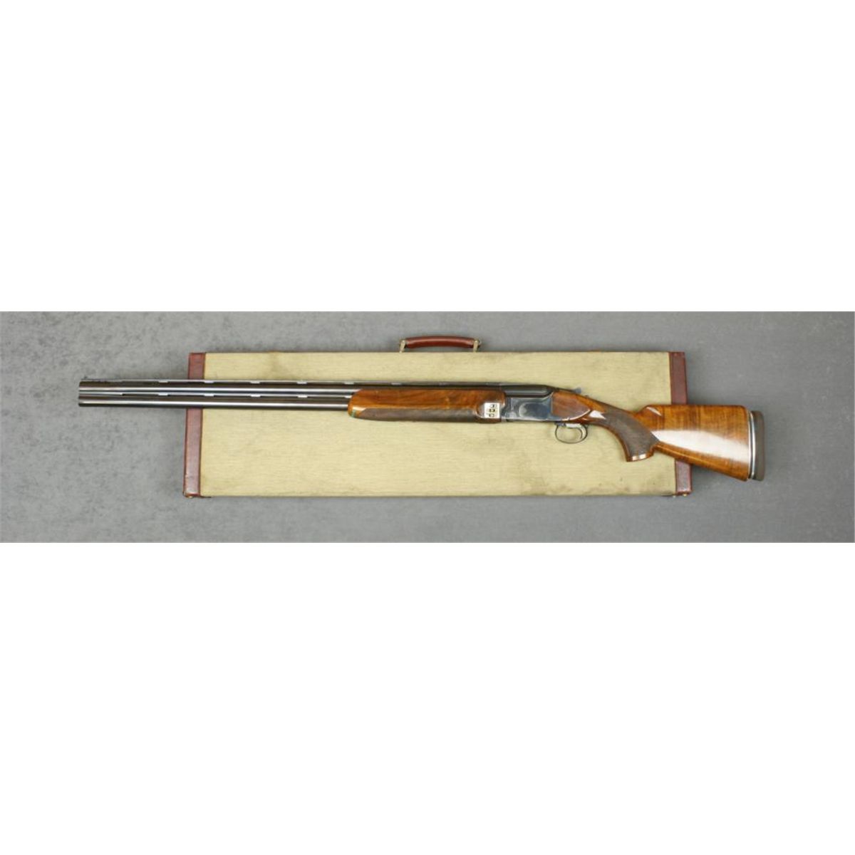 Winchester Classic Trap Model 101 O/U and single shot shotgun, two barrel set in lined carry case, 12 gauge, 32” ventilated rib and ported muzzle O/U and 34” single shot ventilated rib and ported muzzle barrel,checkered deluxe wood stocks with adjustable butt plate, #CT3-733. This set is in overall very good to fine condition showing the majority of original finish on the barrel assemblies and approx. 70% original finish on the receiver; bore are overall very good to fine, actions are crisp, markings good and wood stocks are overall fine; with chokes and tool in case compartment. Est.: $900-$1,800.