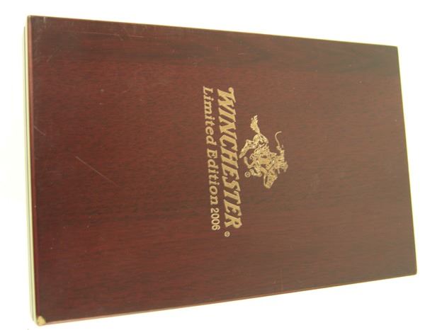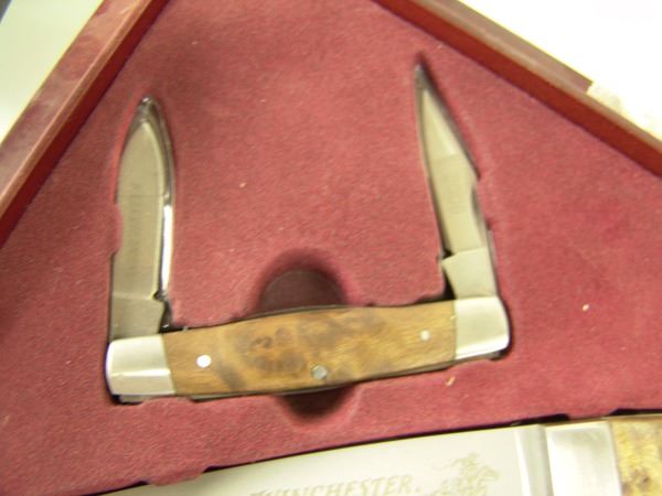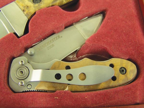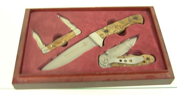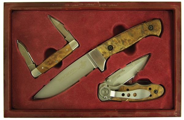 Fine, limited edition, burl wood, three-piece knife set in gift box. Excellent condition.Ca. 2006Largest 8"