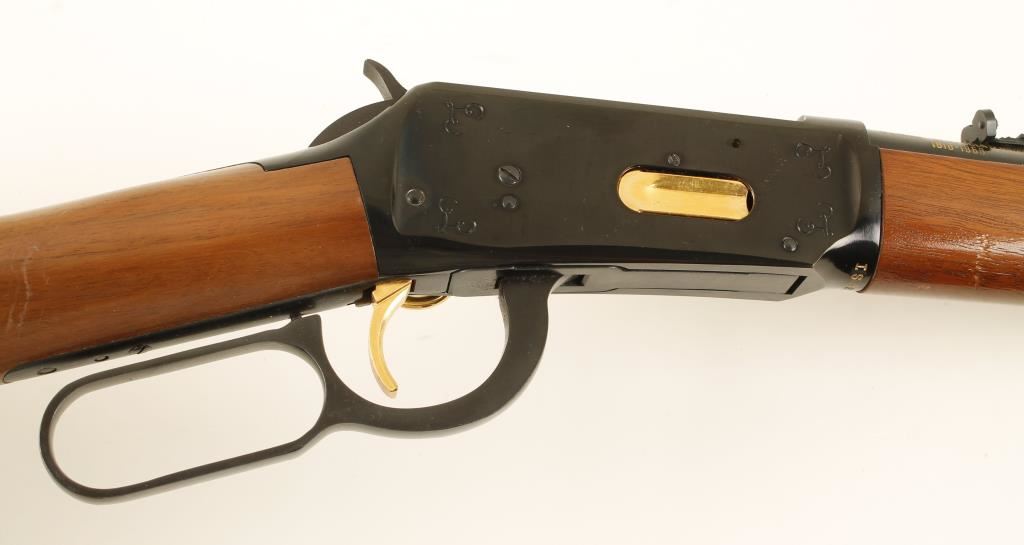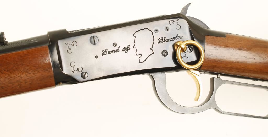 Issued to commemorate the sesquicentennial of Illinois in 1968. Blued saddle ring carbine with gold plated highlights on the saddle ring, butt plate, spring cover, trigger and barrel. Barrel has a small scratch and the magazine tube has a smaller scratch. Lever has a tiny scrape. Wood has a few tiny dings and rubs and scratches. Butt stock has a medallion inlaid in it. Bore is pristine. Action is tight. No box or papers. Condition is very good to excellent. *Modern Firearm*