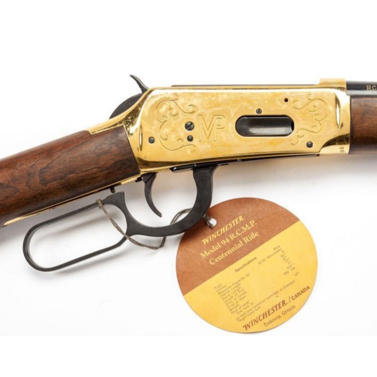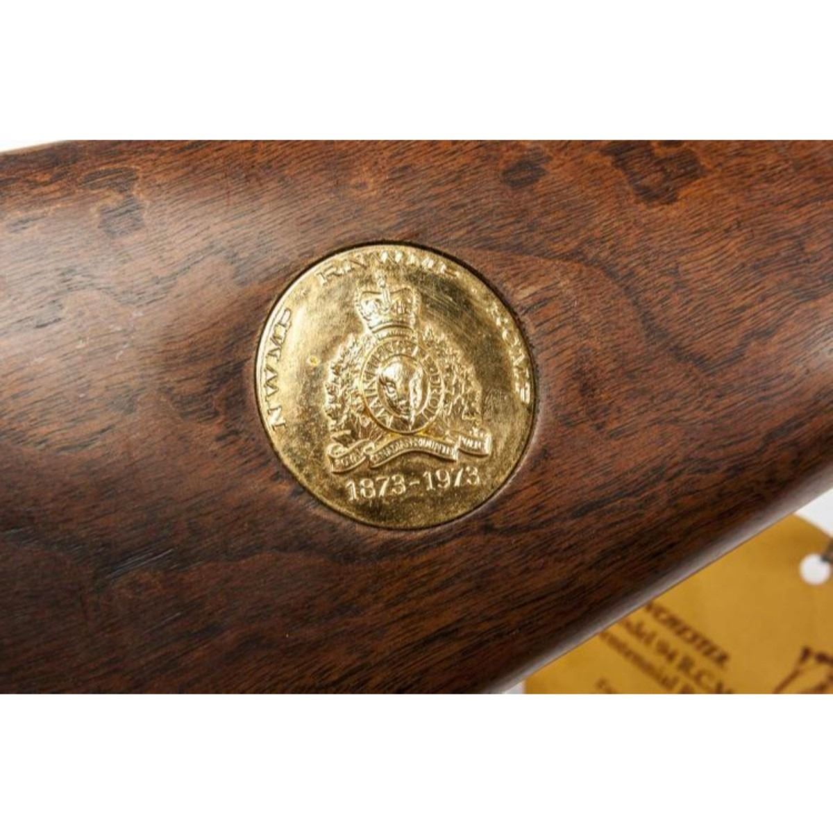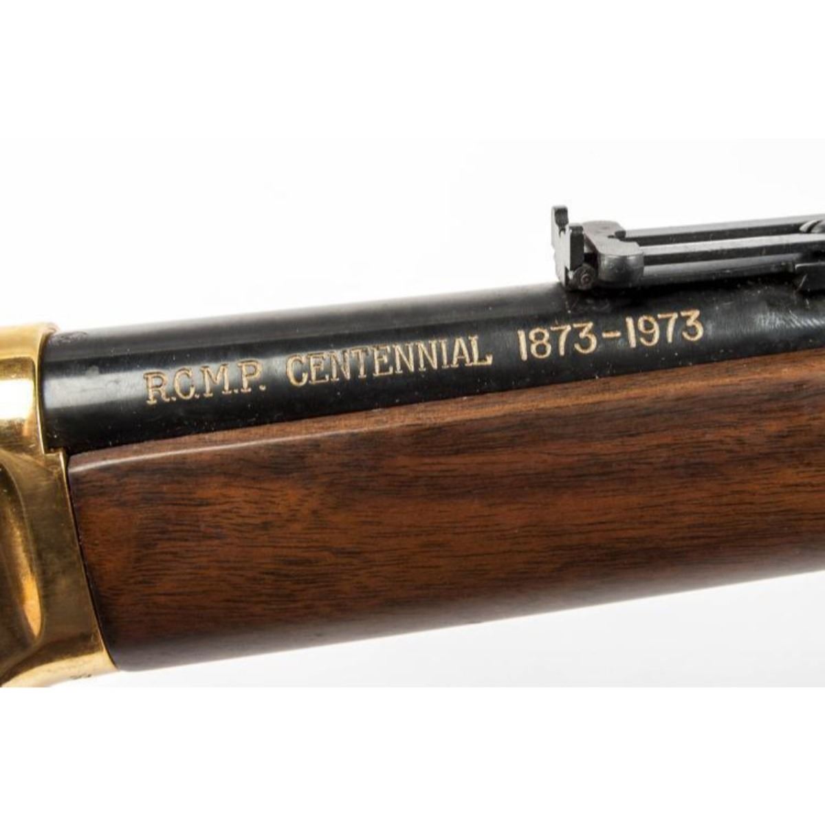 SERIAL NUMBER: RCMP996 DESIGN: Single barrel lever action rifle. 22" barrel. .30-30 Winchester caliber. MATERIAL/FINISH COMPOSITION: Blued metal. Gold plated receiver. Wood stock and forend. Gold plated butt plate. FEATURES: Receiver engraved "1873 1973" with image of Mountie. Barrel engraved "R.C.M.P. Centennial 1873-1973". Peep hole rear sight. With original box of issue with tag and saddle ring. CONDITION: Very Good/Excellent. Light rusting to lever. Appears unfired. INVENTORY NO. / CATEGORY: 5318-001/C&R