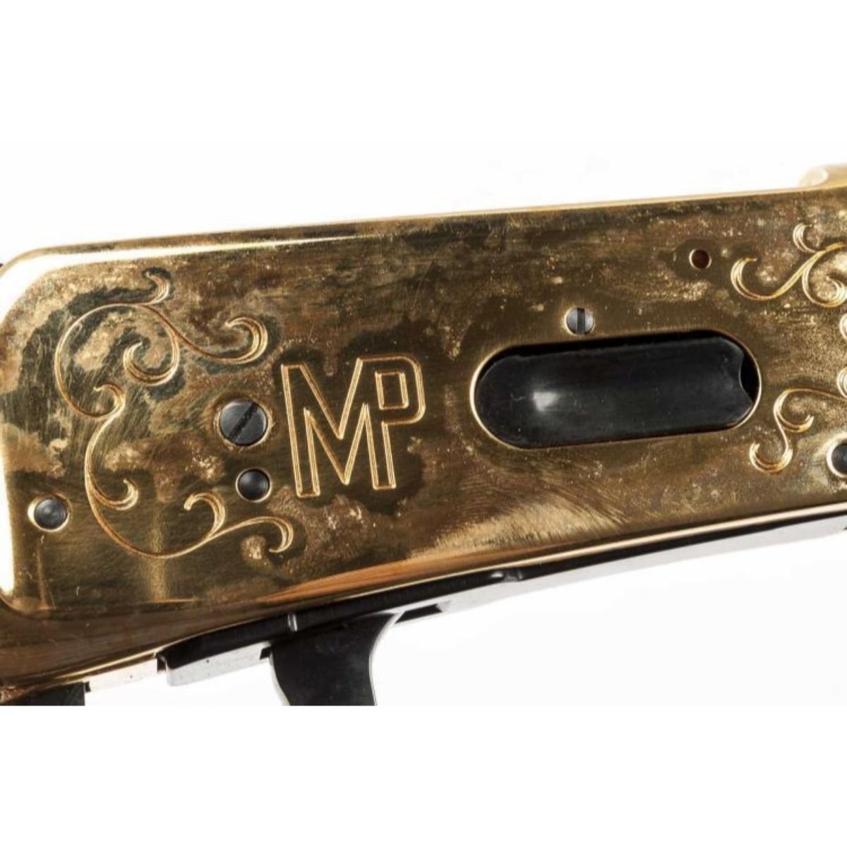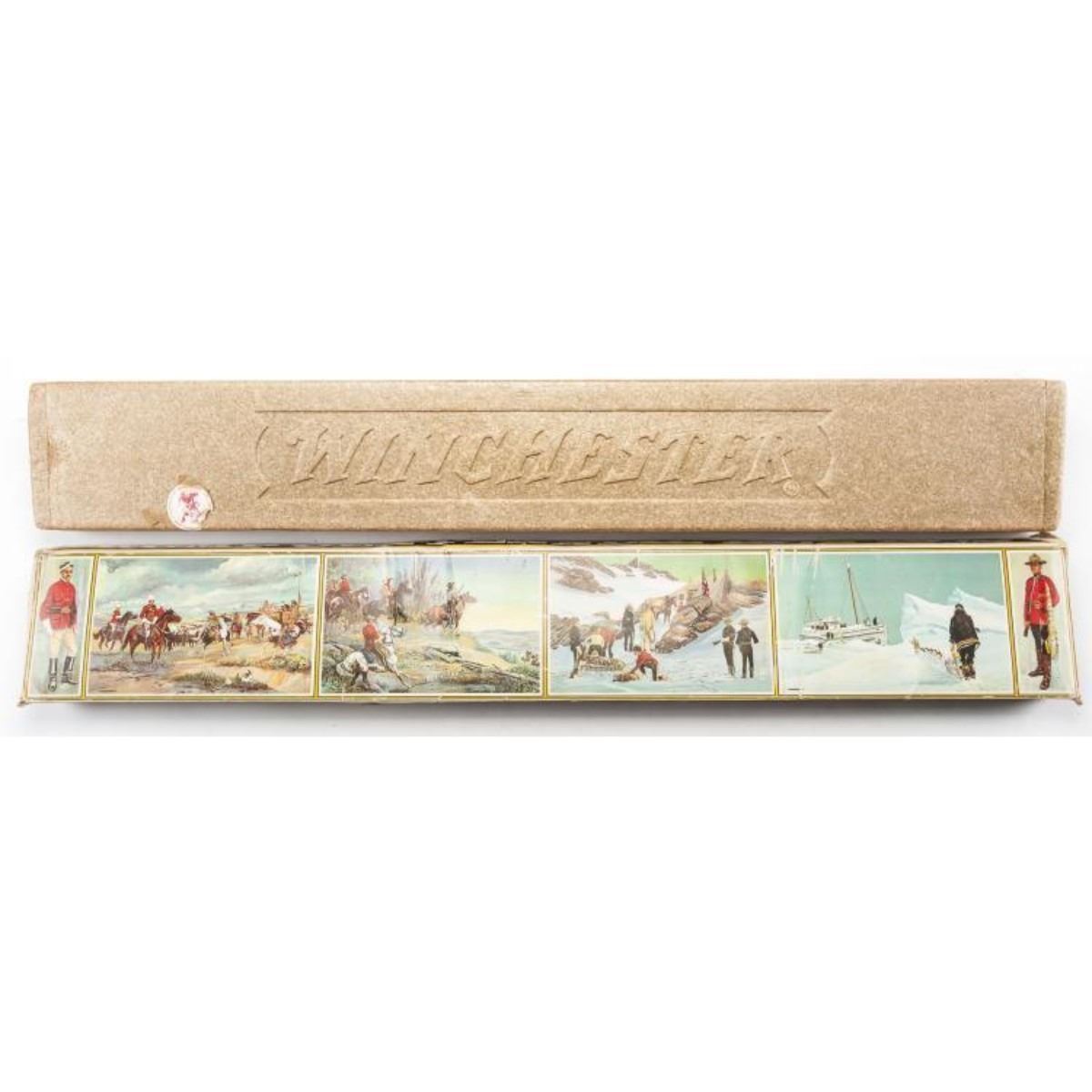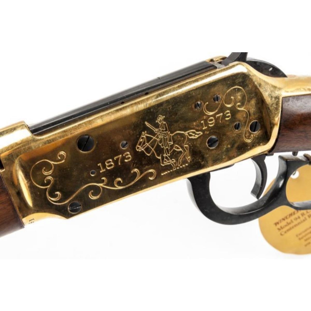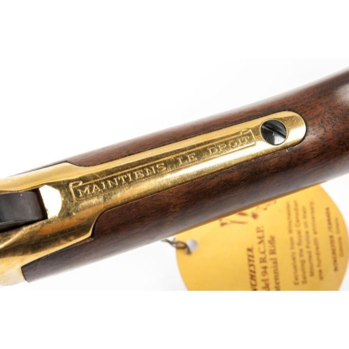 SERIAL NUMBER: RCMP996 DESIGN: Single barrel lever action rifle. 22" barrel. .30-30 Winchester caliber. MATERIAL/FINISH COMPOSITION: Blued metal. Gold plated receiver. Wood stock and forend. Gold plated butt plate. FEATURES: Receiver engraved "1873 1973" with image of Mountie. Barrel engraved "R.C.M.P. Centennial 1873-1973". Peep hole rear sight. With original box of issue with tag and saddle ring. CONDITION: Very Good/Excellent. Light rusting to lever. Appears unfired. INVENTORY NO. / CATEGORY: 5318-001/C&R