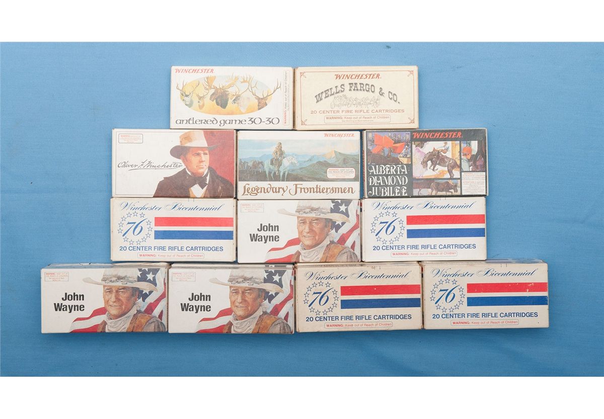 5 boxes of John Wayne 32-40 165 grain cartridges. 6 boxes of Winchester Bicentennial 76 30-30 150 grain silvertip cartridges. 1 box each of; Oliver Winchester 38-55 255 grain cartridges, Wells Fargo & Co. 30-30 150 grain silvertip cartridges, Winchester Legendary Frontiersmen 38-55 255 grains, Antlered Game 30-30 170 grain power point cartridges and Alberta Diamond Jubilee 38-55 255 grain cartridges. CONDITION: All are full and very good or better with one of the John Wayne boxes having some damage and yellowing from aging.