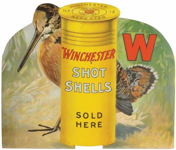 Winchester Die Cut Cardboard Easel Back Sign. Three dimentional display depicting wood duck. Small hole and tear in center. 12 3/4 X 11 inches overall.