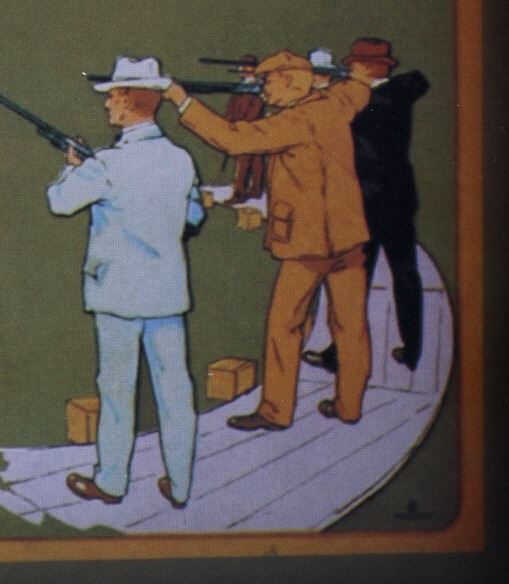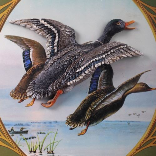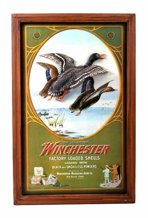 For your bidding pleasure is this Winchester Duck Repeating Arms Calendar Top Print. This print shows a serene scene with two hunters in the background firing shotguns at water fowl taking flight. This print states "They are Hitters, Winchester Factory Loaded Shells Loaded With Black and Smokeless Powders Manufactured by Winchester Repeating Arms Co. New Haven, Conn. New York, San Francisco." The original lithograph is widely attributed to the year 1917.The print is in good condition, with the wall hanging teeth on the back of the print to hang on the wall. The measurements of this print are 27" x 17 1/4".