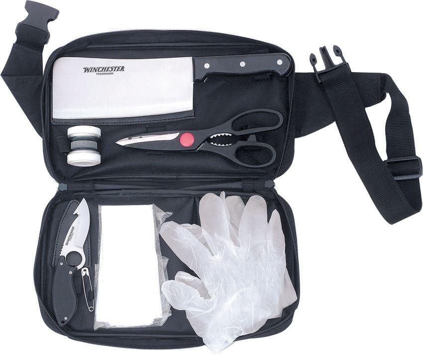 stainless blade. Black smooth synthetic handle. Includes: 12" overall cleaver with 7" blade, 8.5" overall utility shears, 6.5" overall guthook with 2.5" blade, sharpener, large safety pin for tagging game, and an assortment of plastic bags and gloves. Black nylon zippered storage case.