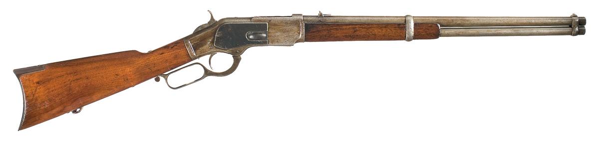 Manufactured in 1877. Blade front and two-leaf folding rear sights, with "P" stamped next to the rear sight and no other visible markings. Receiver has the proper mortised dust cover rails (cover absent), saddle ring on the left side and visible threading on the lever latch. Smooth straight grip stock, with a single barrel band, a sling swivel on the underside of the buttstock, and a curved buttplate with storage compartment.