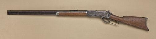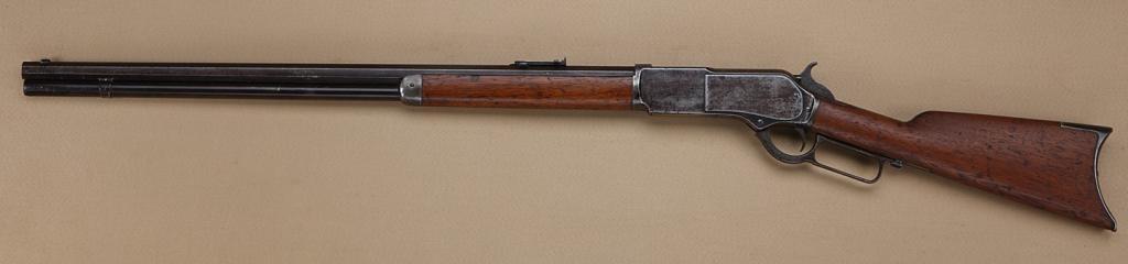 Winchester First Model 1876 early Open Top lever action rifle, .44 cal., 28” octagon barrel, blue finish, wood stocks, #2284. This gun is in overall good to very good condition showing a grey/brown patina onmetal surfaces with some scattered areas of erosion, a couple of old mars to the right side of the barrel halfway to the muzzle and a couple small dents to the left side of the loading tube; good bore, action and markings; set trigger working at time of description, overall good wood with some scattered scratches and mars from carry and storage; a rare variation of the Model ’76. Est.: $6,000-$12,000.