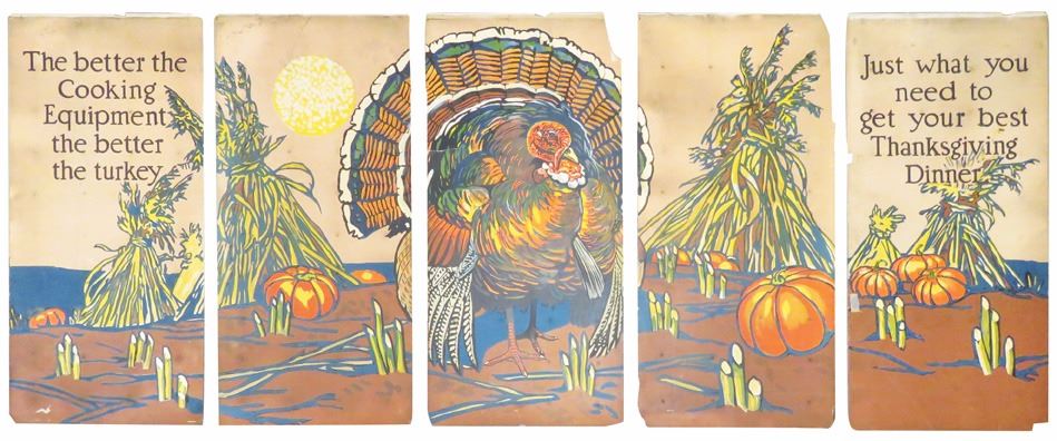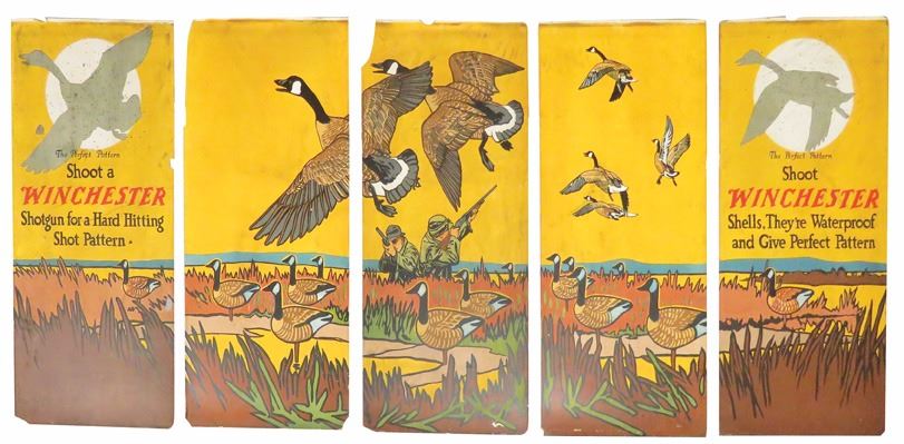 Winchester Five Panel Store Window Display. First side depicting kitchen equiptment for Thanksgiving dinner and the second side "Shoot Winchester Shotguns for Geese". These do not come with original display frames. Fair to good condition. 96 X 42 inches overall.
