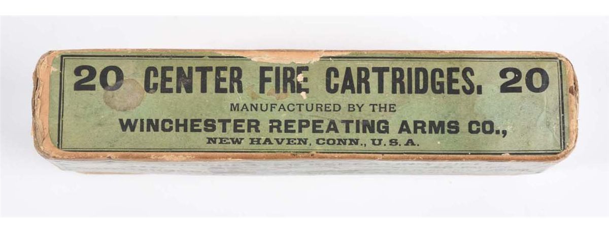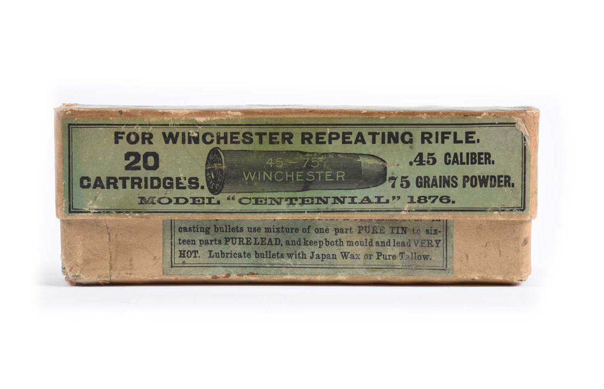 Ammo for Model "Centennial" 1876. Box is strong with slight edge wear. Shells are excellent. Condition (Excellent).