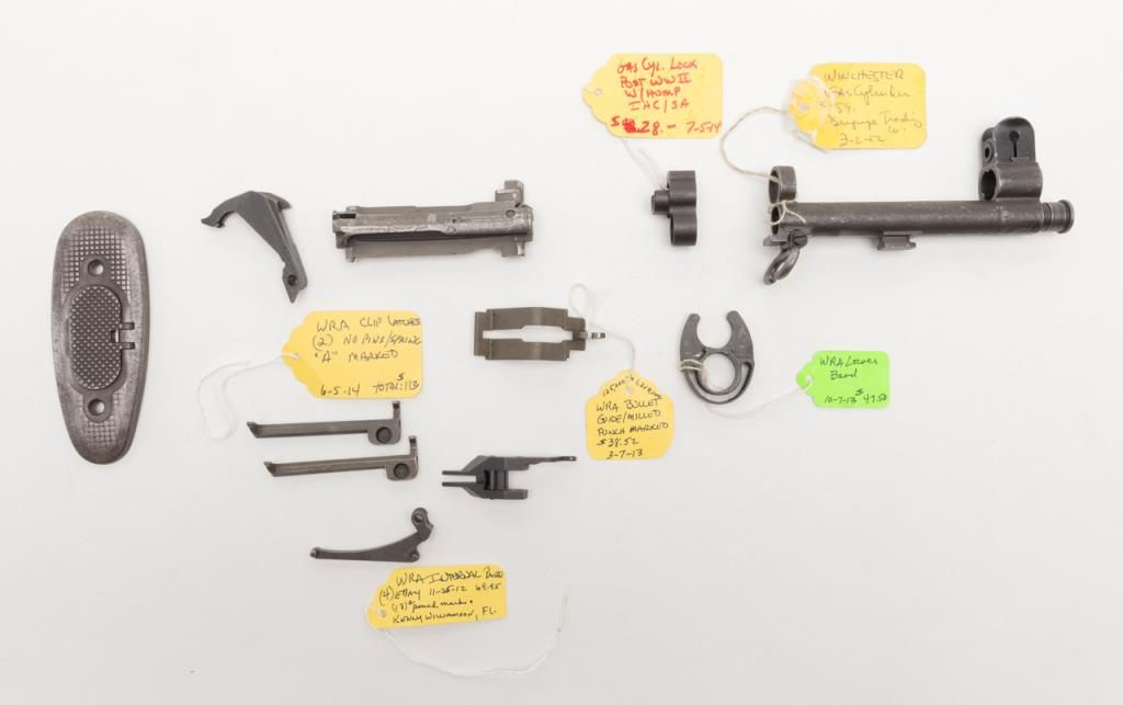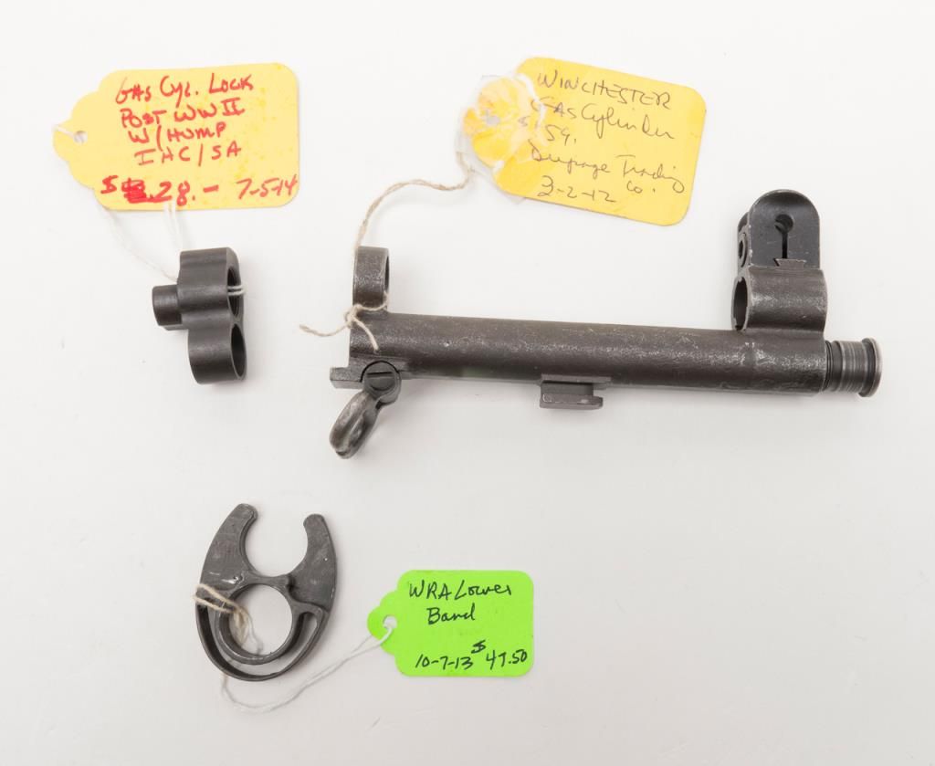 Winchester Garand small parts lot including a late WW II gas cylinder with front sight and sling swivel and gas cylinder lock screw, 2 clip latches (“A” marked), 1 butt plate with trapdoor, gas cylinder lock (post-WW II w/hump IHC/SA), 1 lowerband, 1 bolt housing, 1bullet guide and other goodies, all from a discriminating serious collector’s workbench with individual tags on many pieces indicating where part was obtained, etc.; a great lot! Est.: $350-$700.