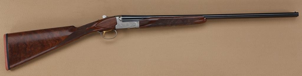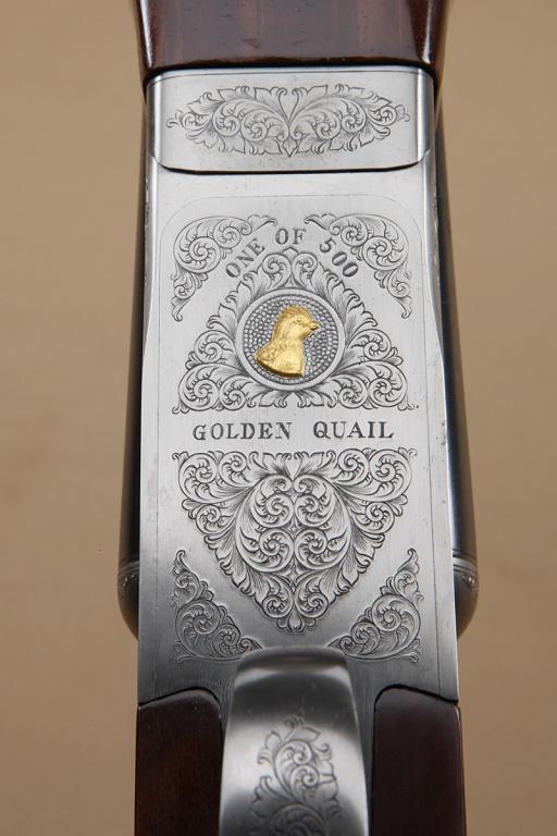 Winchester Golden Quail, 28ga, side by side shotgun, factory single trigger, auto ejector, English style straight grip, 25-5/8” factory barrels. Choked “Improved Cylinder” (right), “Modified” (left). Fine to excellent slightly used condition, 98-99% plus, limited firing, minimal use. Limited edition of only 500, becoming collectable. Serial #GQ44-E. From the Robert Petersen collection. Est: $1,250 - $2,500