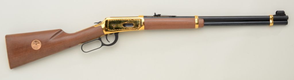 Winchester Golden Spike Commemorative lever action SRC Model ’94, .30-30 cal., 20” barrel, mat black finish to barrel and loading tube, gold colored receiver, wood stocks, #GS3248. This gun is in overall finecondition showing little handling, some slight storage wear, fine bore, fine wood, action needs slight work as trigger does not release hammer; with hanging pamphlet; with factory cardboard shipping box and sleeve.Est.: $300-$600.