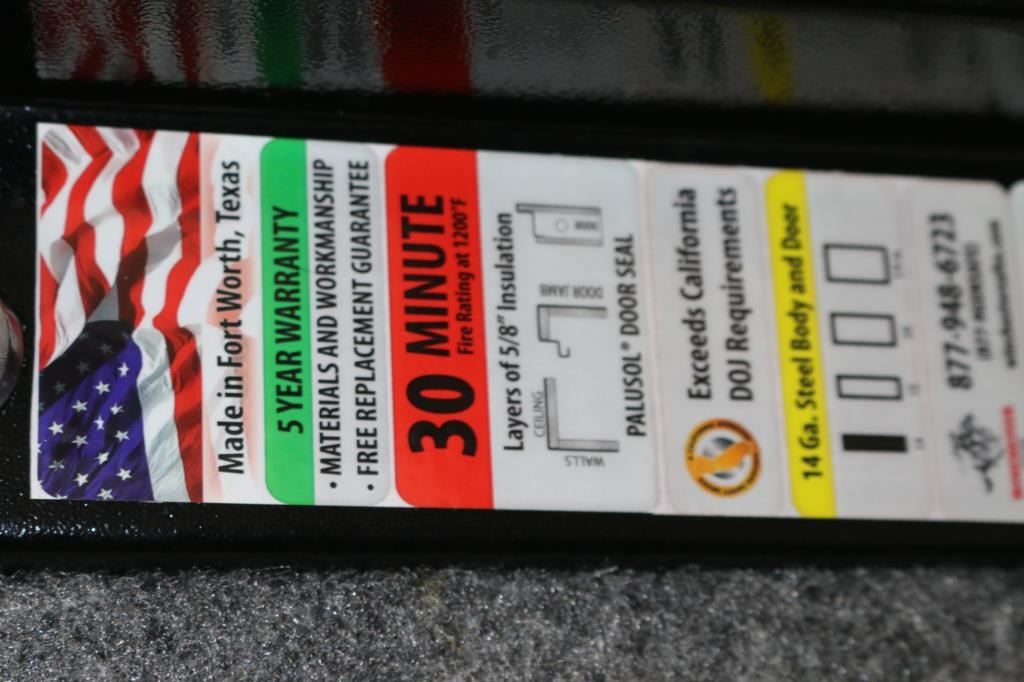 Black, combination safe (combo with paperwork that comes with safe.) Measures 60" tall by 22" wide by 18" deep. Carpet lined, in excellent condition.