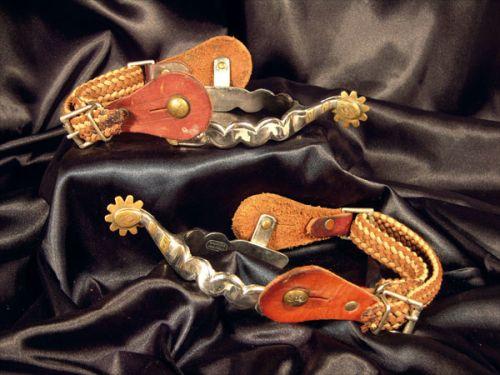 Winchester Hand Forged Spurs, marked with a star and R, brass overlay. Braided leathers. Excellent condition.