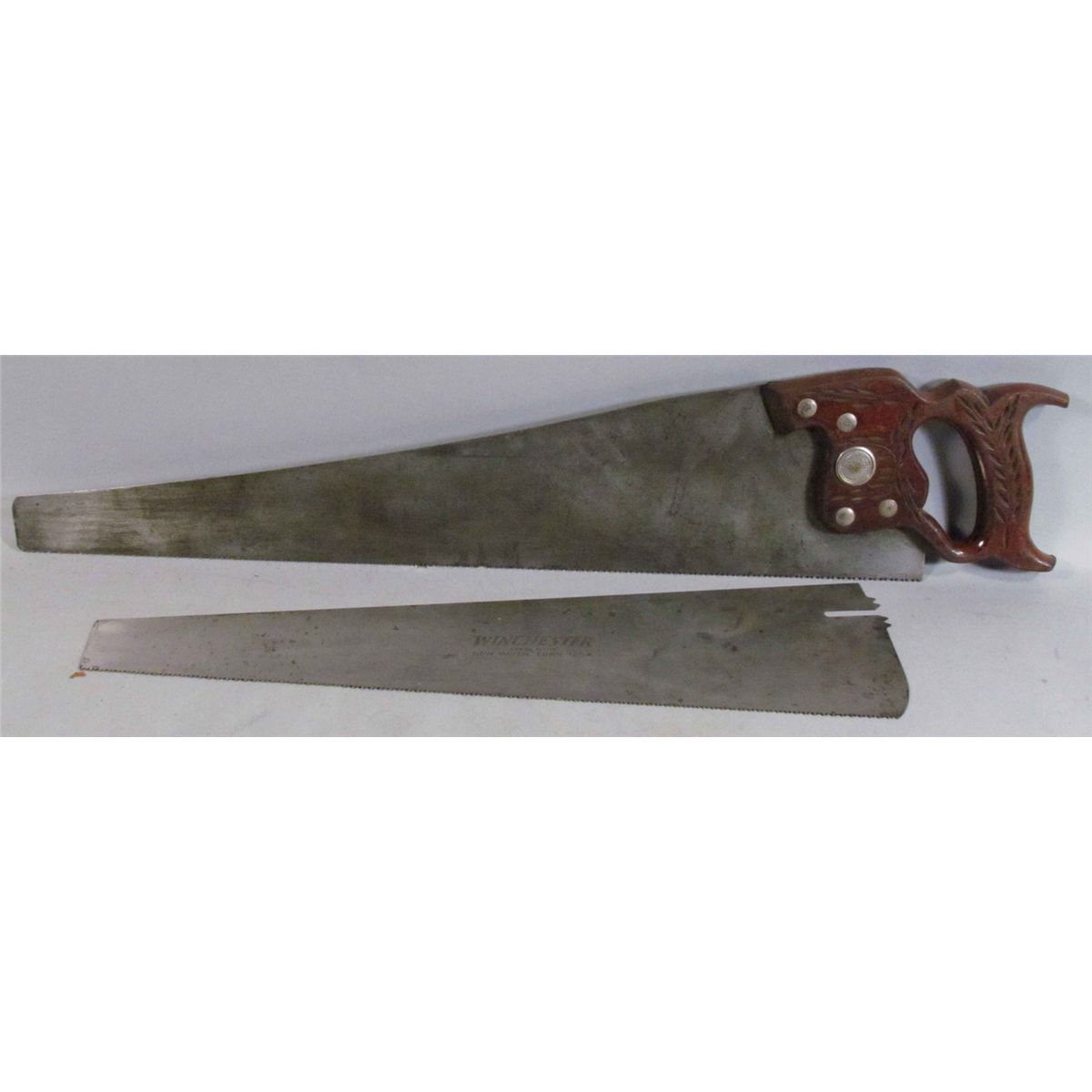 Winchester hardware saw with extra blade, no. 40. carved wood handle, Winchester button logo and etched blades. Good original condition. 28 inches long.