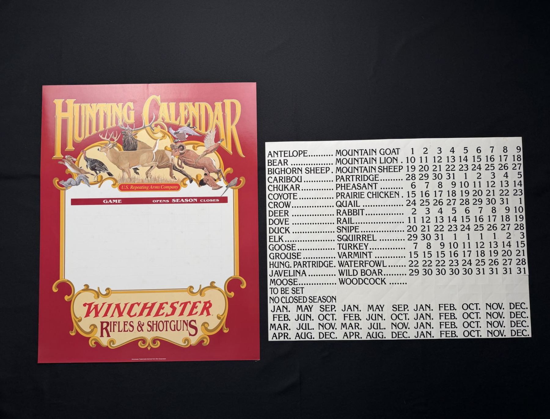 Deadstock. These were distributed to Gun and Sport shops with stickers so they could fill in state hunting dates. Calendar measures 22" by 28"