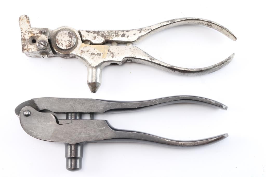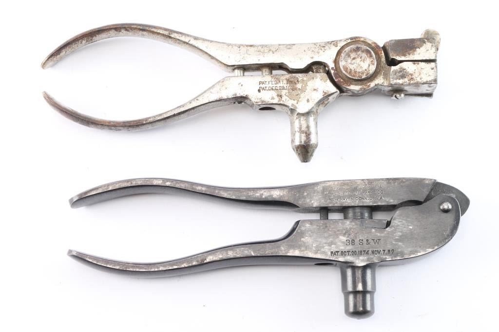 Winchester patent 1874/82 in 38 Smith & Wesson caliber, along with an Ideal combo in 25-20. The Winchester tool shows 80-90% original blue and is very good plus to almost fine. The Ideal tool shows 60-80% nickel and dark patina and rust where finish is missing. The cavity in mold is very good.