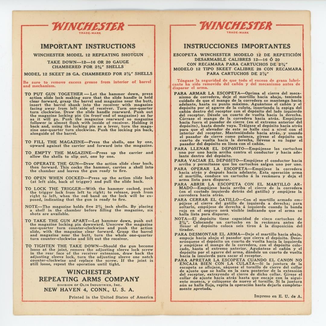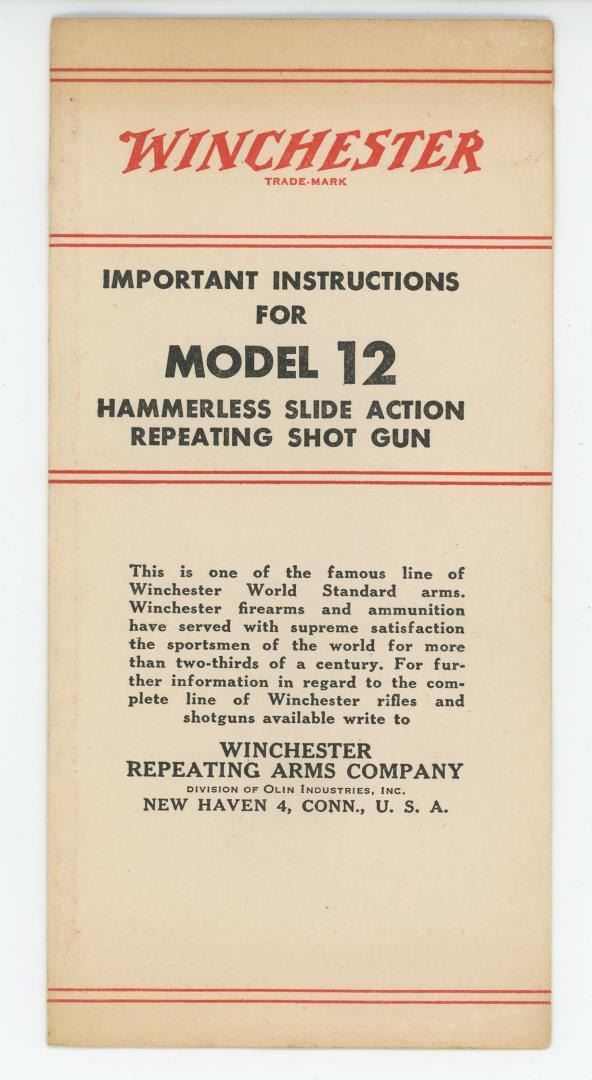 Important Instructions for Model 12 Hammerless Slide Action Repeating Shotgun. Nice original manual.