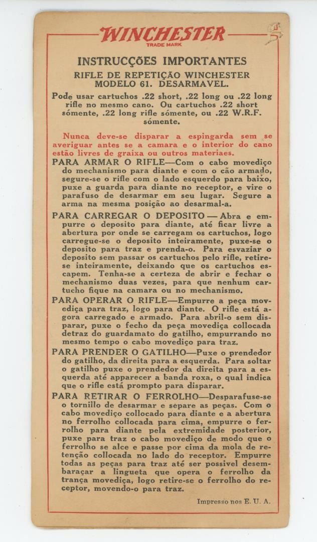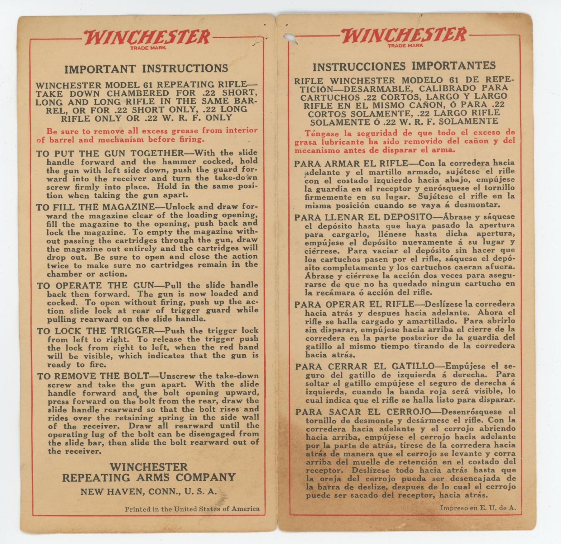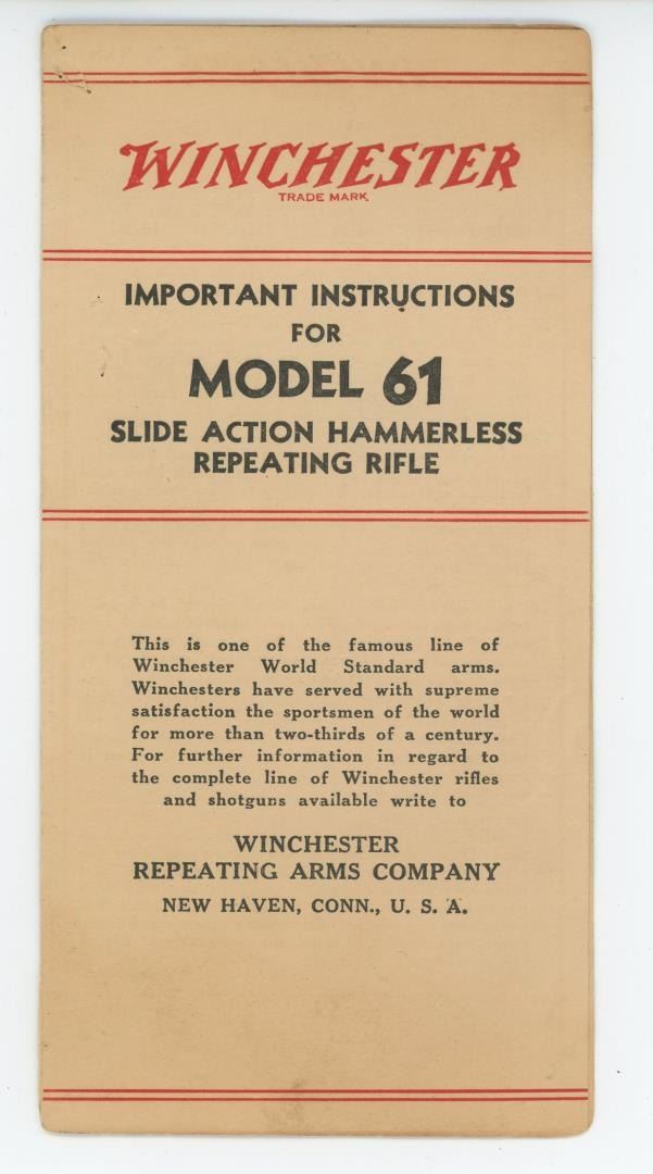Important instructions for Model 61 Slide Action Hammerless Repeating Rifle. Nice original example.
