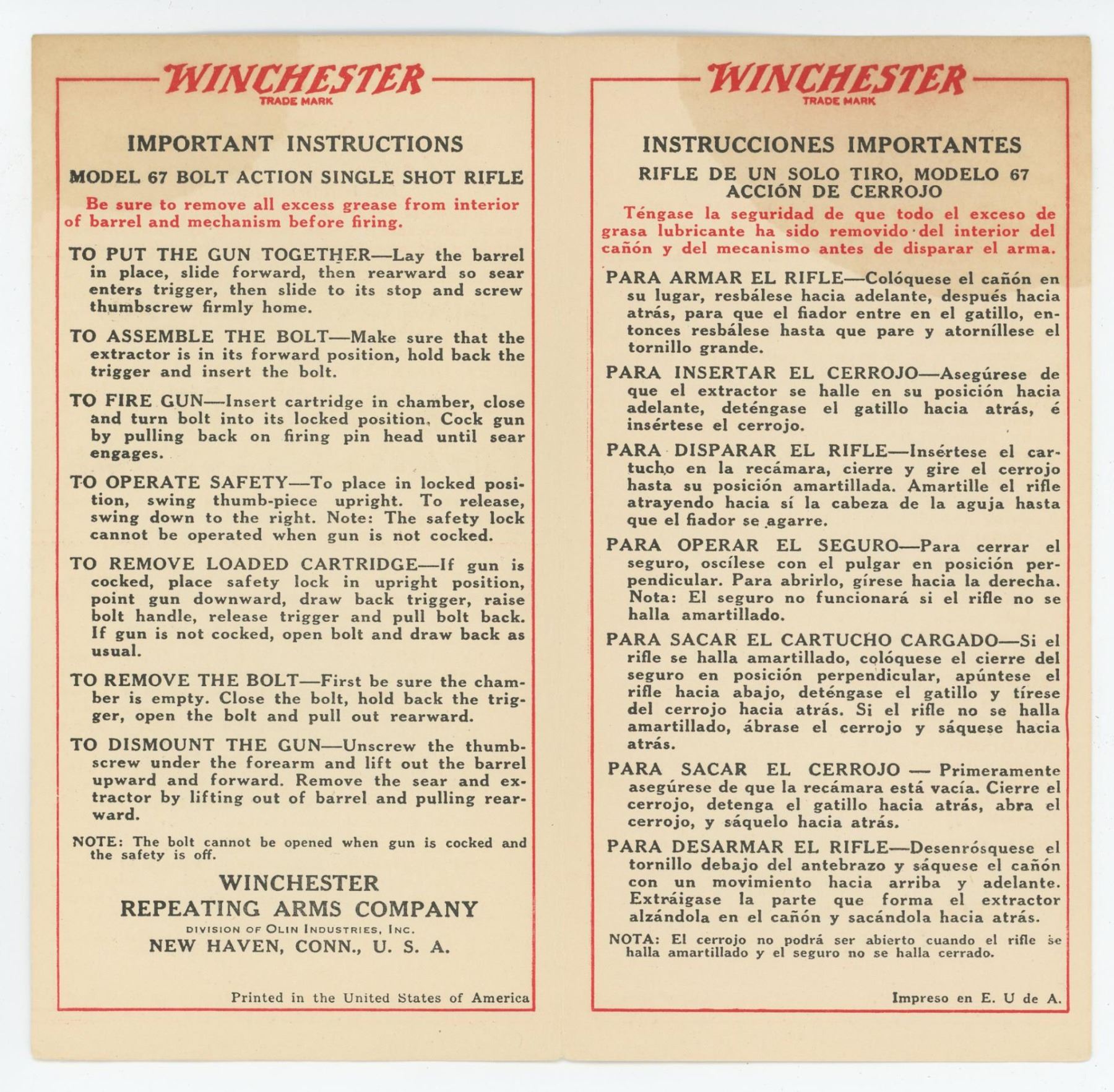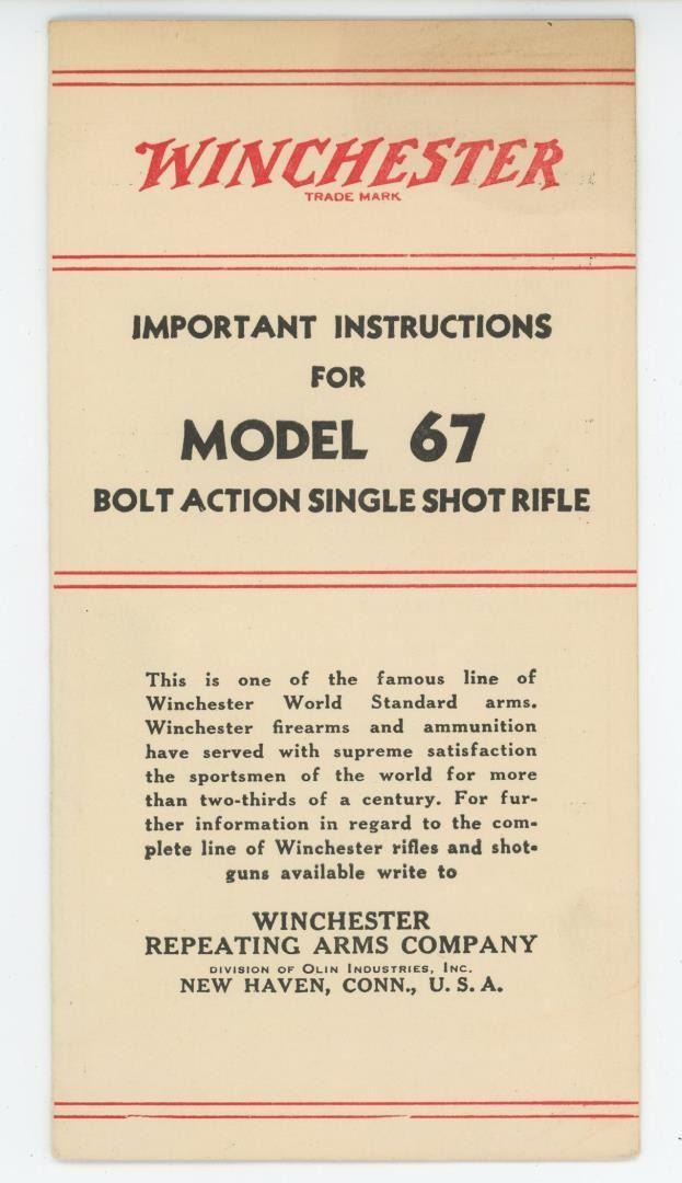 Important Instructions for the Model 67 Bolt Action Single Shot Rifle. Nice original example