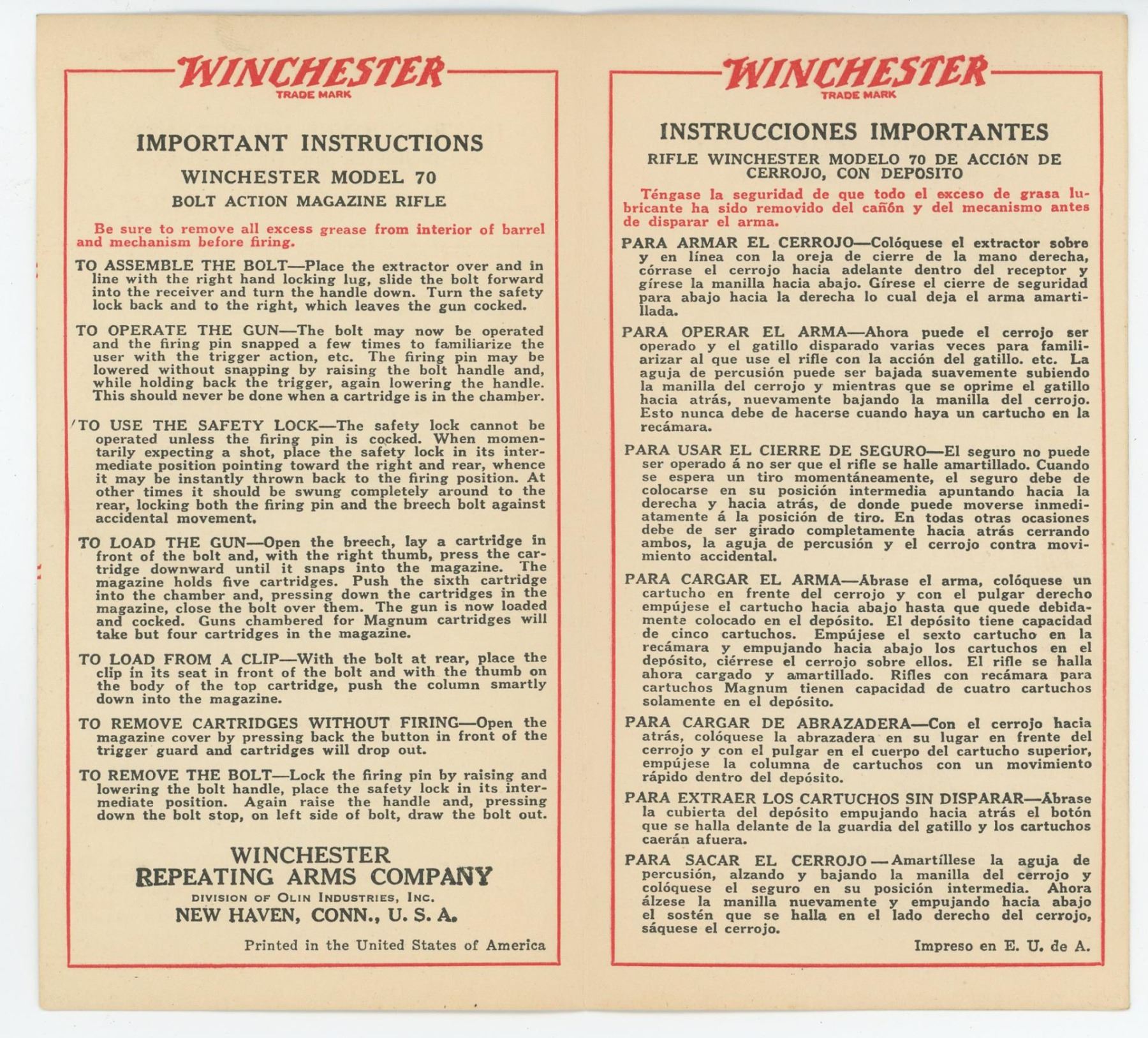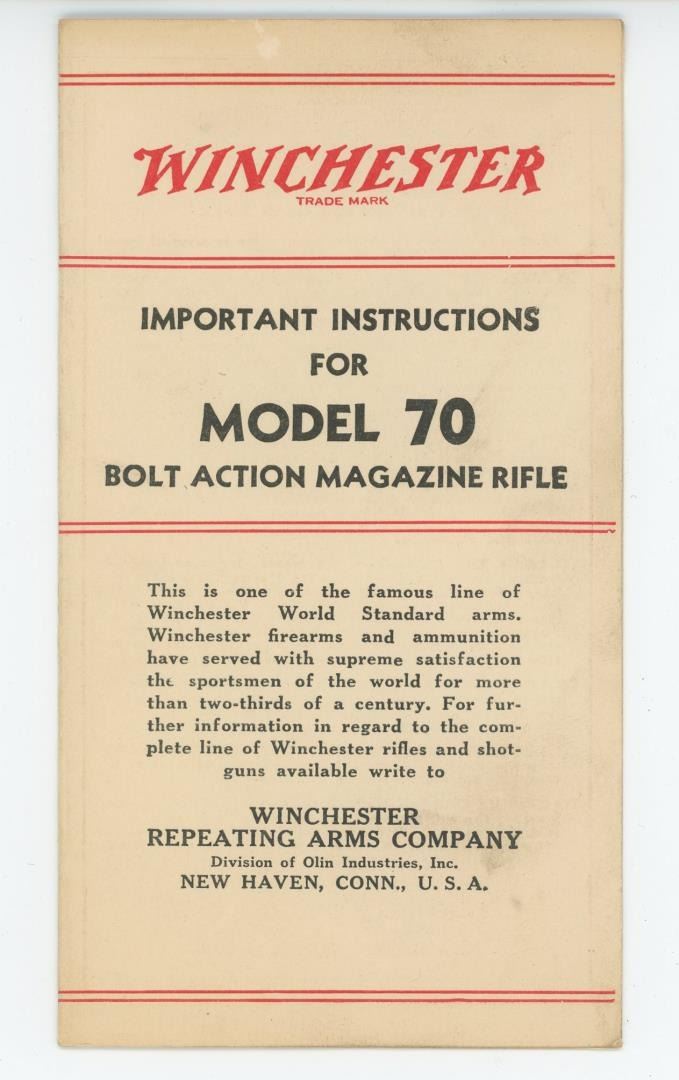Important Instructions for Model 70 Bolt Action Magazine Rifle. Nice original manual.