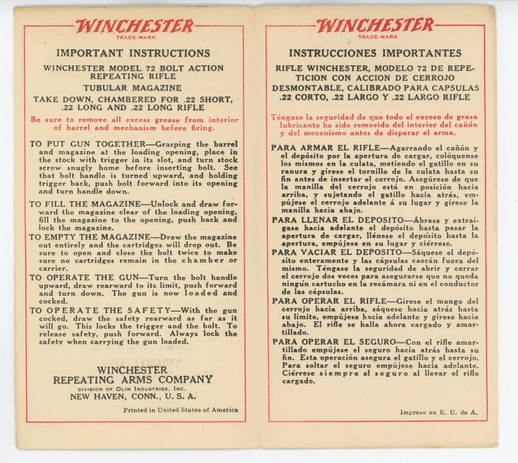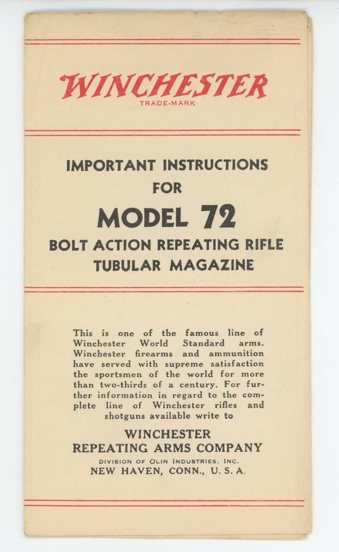 Important Instructions for Model 72 Bolt Action Repeating Rifle Tubular Magazine. Nice original manual.