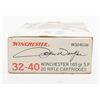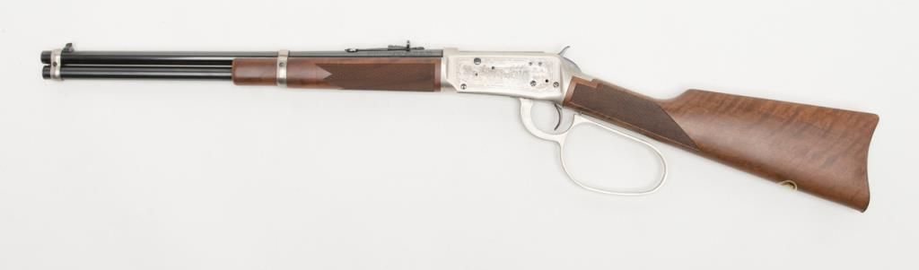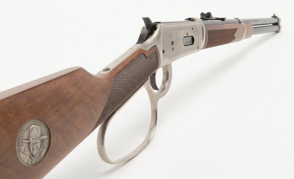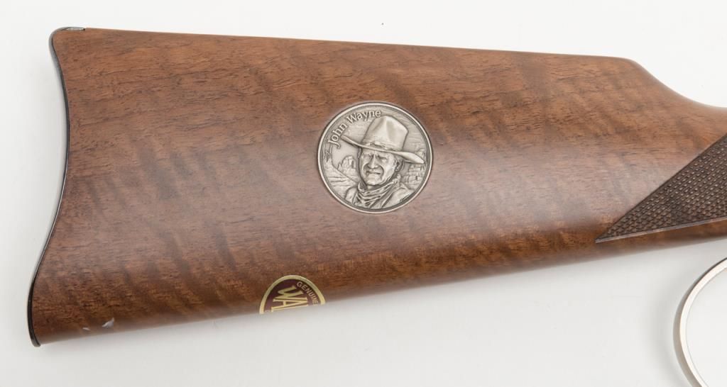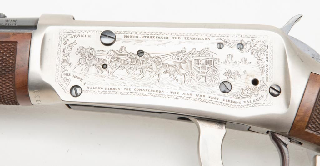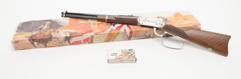 Winchester John Wayne Commemorative Model 94, #JW47389, .32-40 cal., large loop lever, two tone finish with checkered walnut stock. Rifle is in near mint condition showing just minimal scratches and mars from handling. Saddle ring is missing,one screw head slightly marred. Bore is mint, action is crisp. In original Winchester box in good condition with instructions. Box sleeve is tattered and missing a 3" portion of the end of the cardboard sleeve. Also includes a box ofWinchester John Wayne Commemorative .32-40 ammunition in very good condition. (C&R / PPT) Est.: $900-1800.