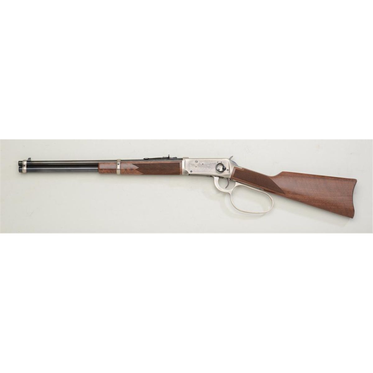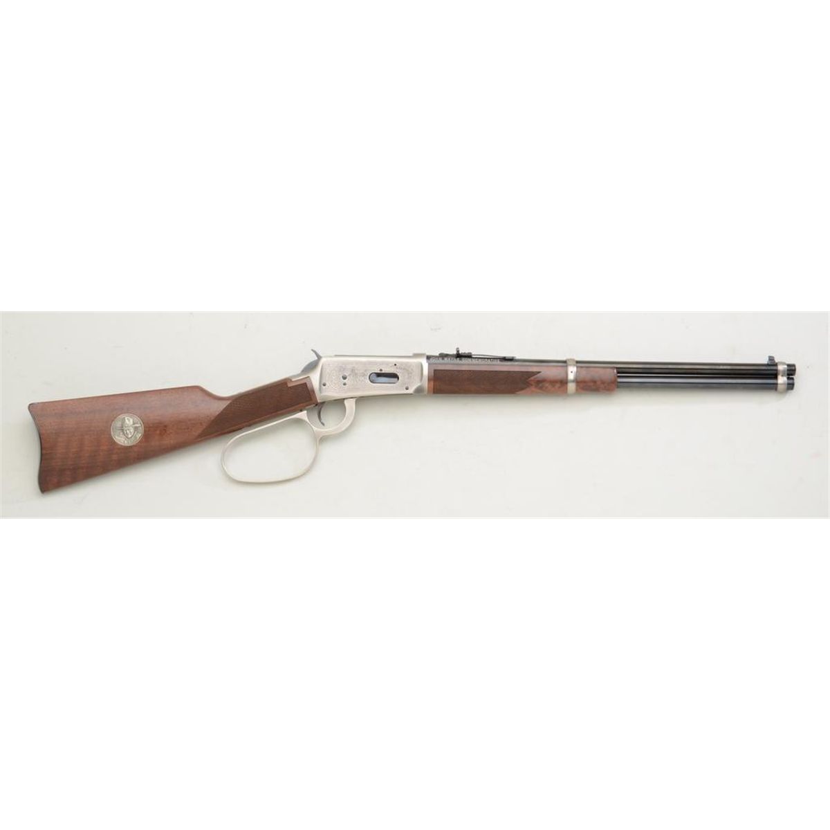 Winchester John Wayne Commemorative Model 94 lever action SRC, .32-40 Win. cal., 18” barrel, black finish to barrel assembly with ornamented mat nickel finish to receiver and extended lever, checkered wood stocks withJohn Wayne Commemorative coin inlaid in right side of butt stock, #JW 10232. This gun is in overall like new condition showing little handling and contained in factory shipping pack with instructions, hang tag and factorycardboard sleeve. One of the most popular of the Winchester Commemorative offerings and this one is near mint. Est.: $750-$1,500.