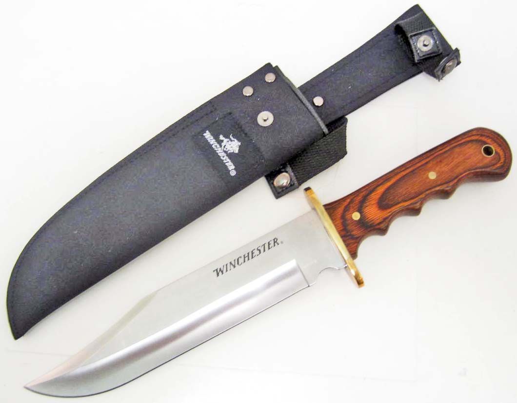 14" overall. 8 5/8" surgical stainless blade. Finger groove wood handle with brass guard and lanyard hole. Black nylon belt sheath.