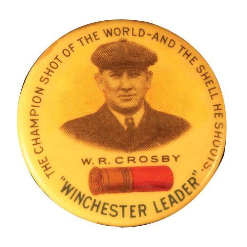 Celluloid Pinback advertising Winchester Leader Shot Shells, depicting Champion Marksman W.R. Crosby. 1 1/4 inch diameter.