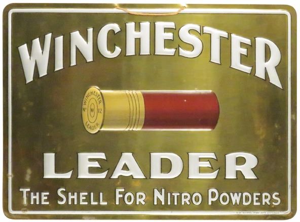 Winchester Leader Embossed Tin String Hanging Sign. Chas. A. Shonk Sign Mfg. Excellent condition. 13 1/4 X 9 3/4 inches.