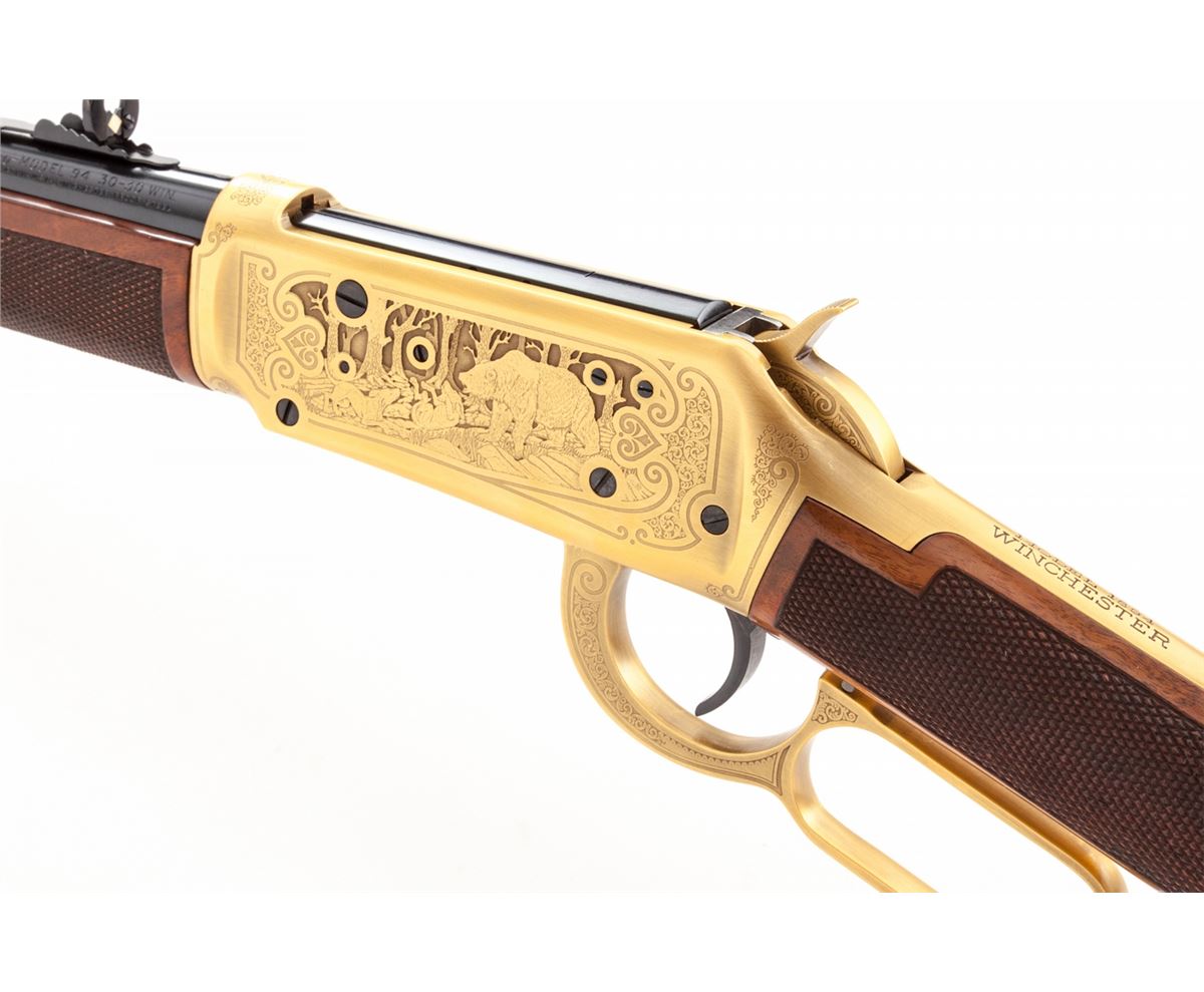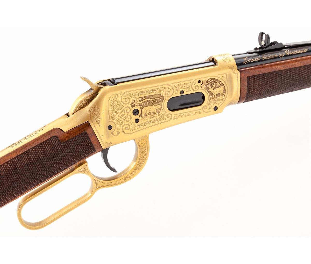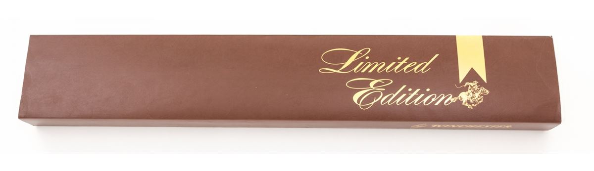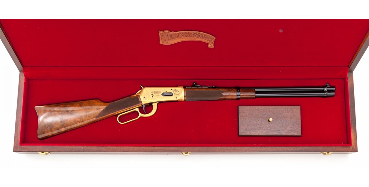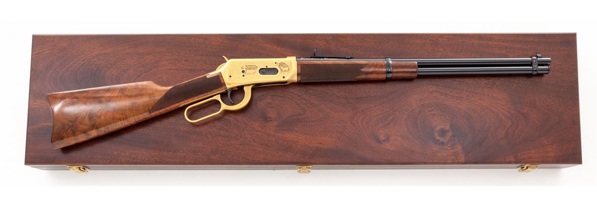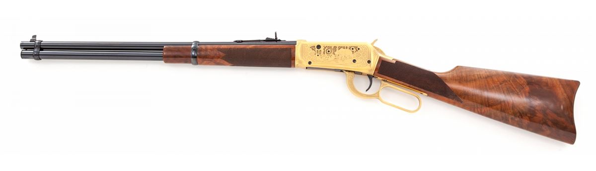 Winchester Limited Edition I Lever Action Rifle, #77L70, .30-30 cal., 20'' barrel, gold-plated satin-finished receiver with triple-relief etched classic Winchester engraving, left side with hounds and grizzly; right side with mountain lion and mule deer; factory checkered select walnut stock. Considered one of the less common and more desirable Winchester commemoratives with just 1500 produced. Condition is excellent, appearing as new and unfired, showing only the lightest marks near hinge portion of lever. In original box with gold embossed brown slipcover, and original packing case, as well as the factory velvet-lined wooden case with brass hardware. Additionally included is the very scarce leatherette booklet that includes the histories of the '94 and the engravings of John Ulrich, with original warranty card and letter from then-Winchester President Phil H. Richey stating that this 1970's gun was mfg'd June 27, 1978. Est.: $1,500-$2,000. (Modern)