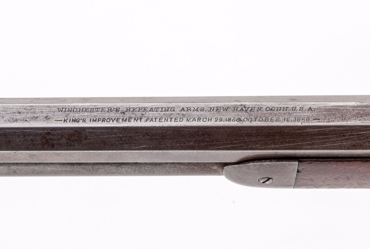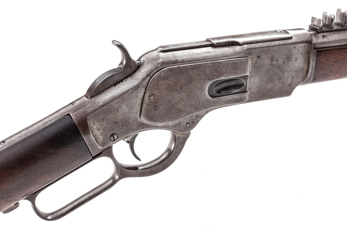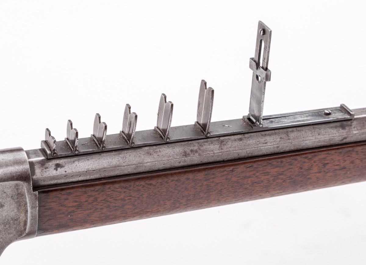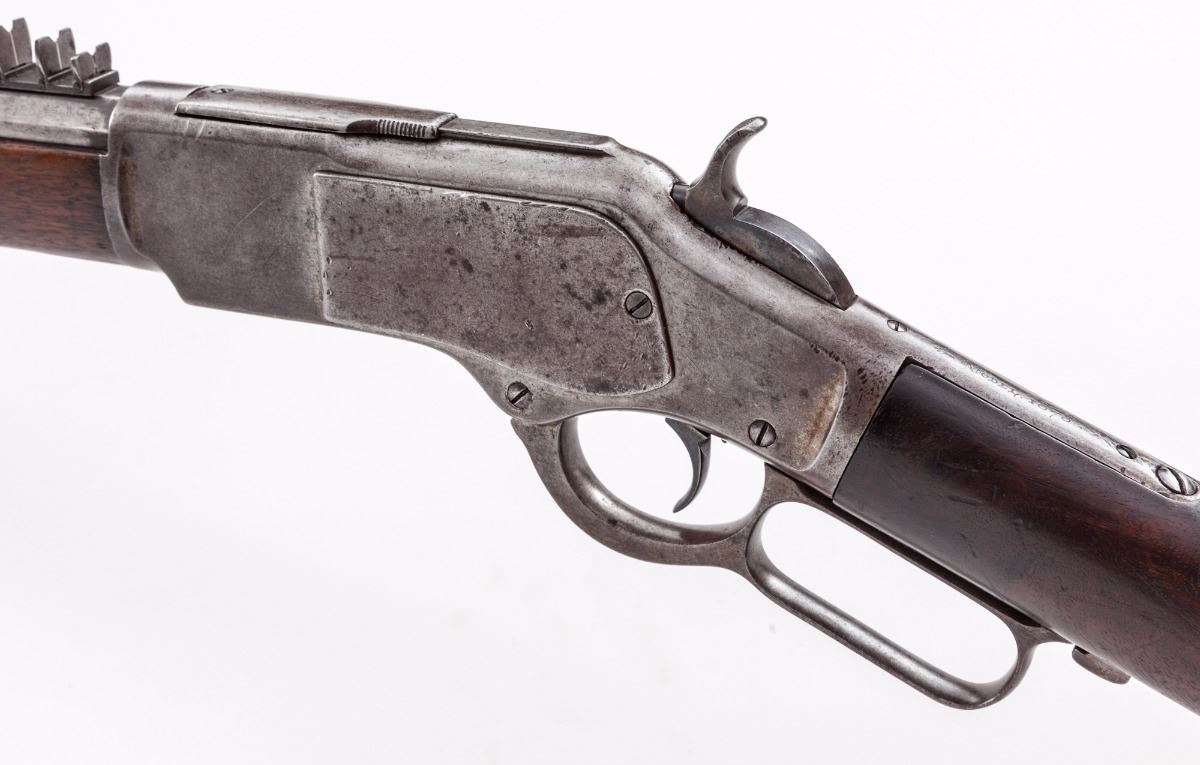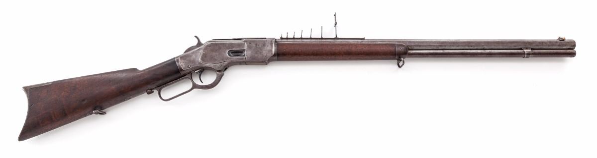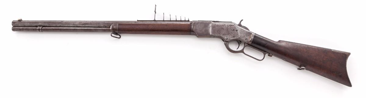 Winchester Model 1873 Lever Action Rifle, with factory 7-Leaf Express rear sight and Beach front sight, #334170, .44 WCF cal., 24'' octagonal barrel, originally with blue finish, dustcover, straight walnut stock and forend, crescent buttplate and brass trap, and sling swivels mounted to forend cap and buttstock. Top barrel flat is marked ''Winchester's Repeating Arms, New Haven, Conn. U.S.A. / King's Improvement Patented March 29, 1866, October 16, 1860''; upper receiver tang is roll stamped ''Model 1873'' in fancy script; lower tang is marked with the serial number behind the lever latch. With factory letter verifying all features, including 7 Leaf Express and Beach sights, shipped November 14, 1890, to Order number 19479. (See page 316 of ''Winchester's New Model of 1873, A Tribute'', Vol. I, by James D. Gordon, where he states ''The rarest and perhaps most interesting rear sight found on Model 1873s is the 'Winchester Seven Leaf Express'. Because of the length of the Seven Leaf sight, the factory had to move the barrel address further ahead than normal on such guns and put the caliber marking on the side of the barrel.'' Condition is very good with no original finish remaining but with a nice light gray patina with brown/reddish highlights overall. Dustcover with some light pitting; left sideplate and frame around hammer and near wrist with small impressions; hammer with faded case colors remaining. The 7-Leaf Express sight retains all its leaves and shows no signs of repair. Buttstock and forend show oil darkening and normal scratches and normal signs of age and wear; forend remains sound with no cracks or breaks. Left side of buttstock is marked ''44''. Action is fine, bore is dark with general corrosion. An attractive Winchester 1873 with the hard-to-find factory 7-Leaf Express sight feature. Est.: $6,500-$8,500. (Antique)