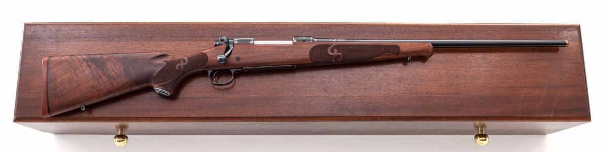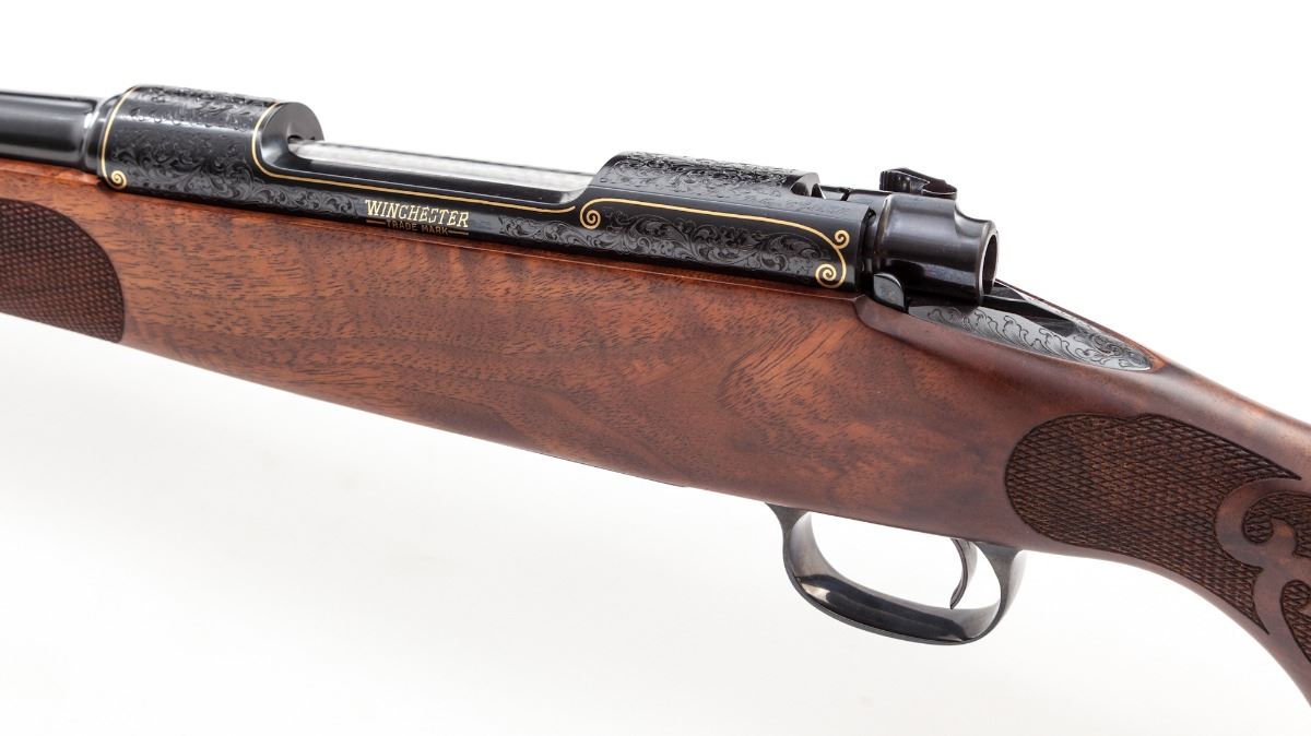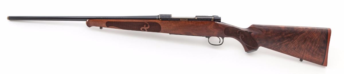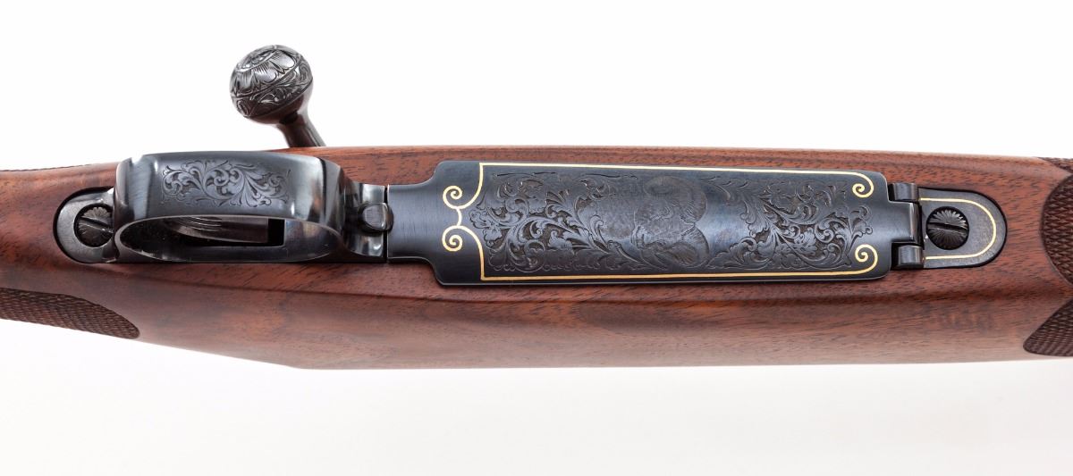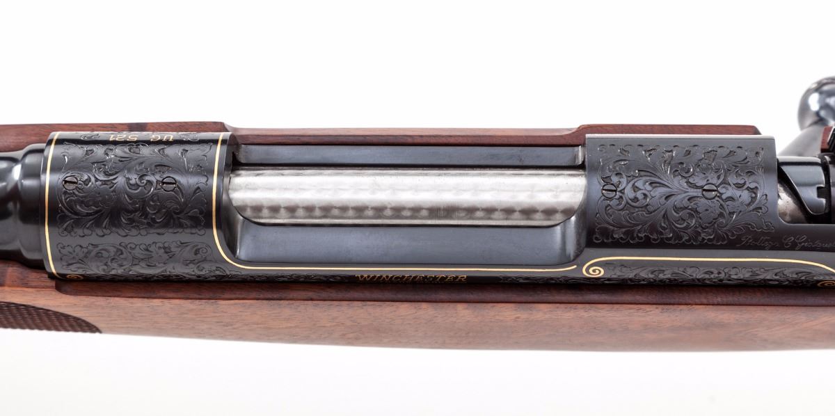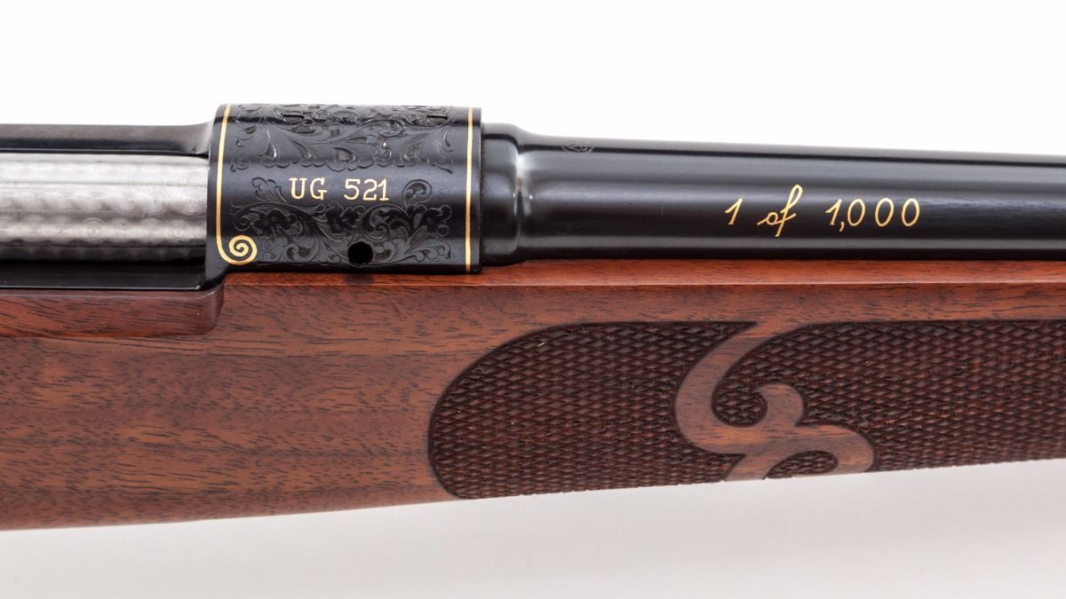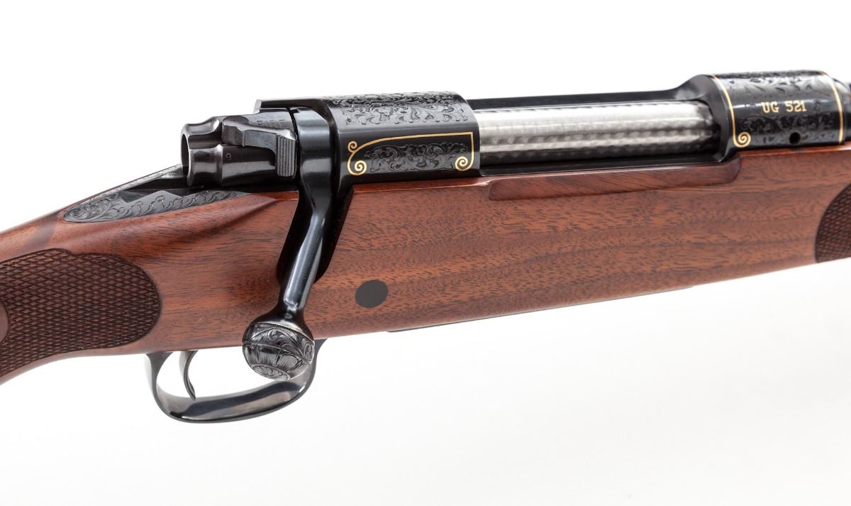 Winchester Model 70 Featherweight Ultra Grade 1 of 1,000 Bolt Action Rifle, #UG521, .270 Win. cal., 22'' bright blue finished barrel and receiver with full leaf scroll engraving and gold line borders on receiver and encircling a bighorn sheep profile on floorplate; engraving pattern follows to the bolt knob, triggerguard and pistol grip cap, with two gold barrel bands at the muzzle. Engraved in Italy by Bottega C. Giovanelli engravers. Receiver is drilled and tapped for scope mounts. The checkered pistol-grip deluxe walnut stock has a satin finish with sling swivel eyelets. Mfg'd ca. 1984. Included with the rifle is a red felt lined mahogany display case. Condition is excellent, appearing near new, with a few light handling marks and plum discoloration on the bolt shroud; forearm inletting is fractionally oversized. Est.: $2,500-$3,500. (Modern)