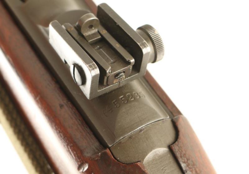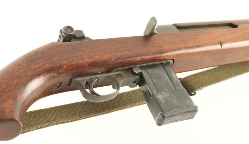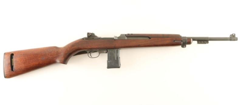U.S. Military contact semi-automatic service rifle chambered in .30 carbine, circa 1944. Features a parkerized finish, Winchester proofed 18" barrel, shrouded blade front sight stamped "R", adjustable rear aperture sight stamped with an "H" inside a shield, "JM" marked wide barrel band with bayonet lug, "W" marked recoil shield, four-rivet handguard with wide groove, push button safety stamped "EW", push button magazine release stamped "M", 15 round steel magazine, smooth trigger, round bolt, green canvas sling, checkered metal buttplate and pistol grip walnut shoulder stock with low-wood forend, oval cut oiler slot, "W" stamp inside the sling well & [crossed cannons] cartouche on the right side of the stock. Rifle retains approximately 90% of it's parkerized finish showing bright wear on the bolt & receiver and some scattered rubs. Action is smooth, bore is bright with some minor blemishes, and the wood stocks are very good with scattered dings. Condition is NRA very good. ***C&R Firearm***
