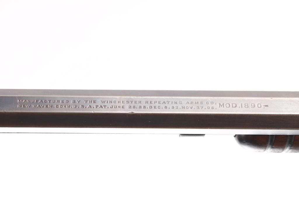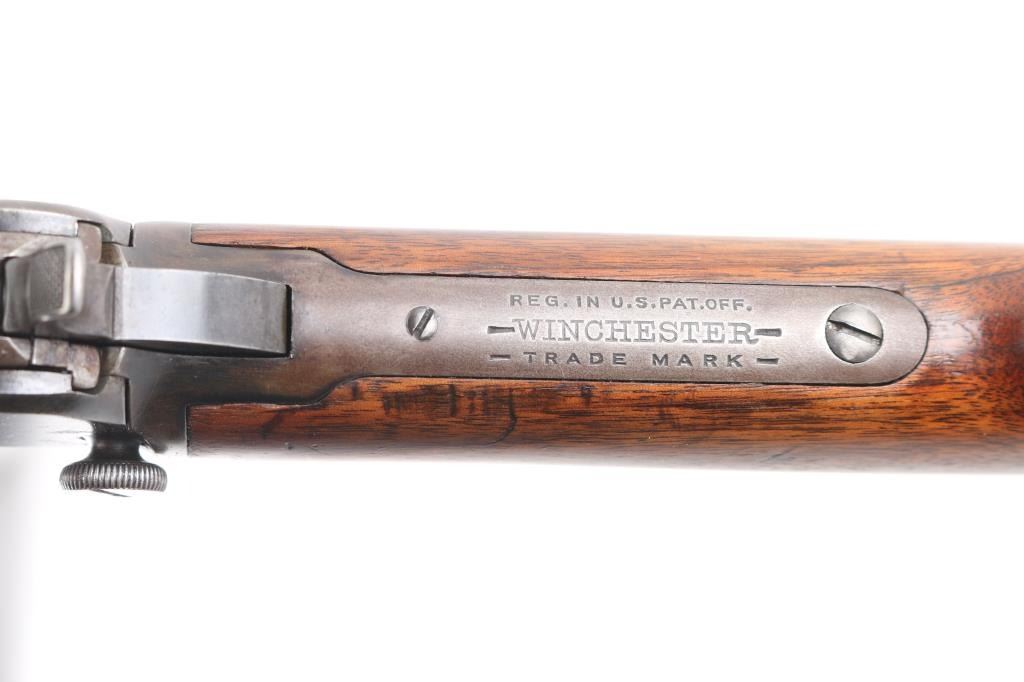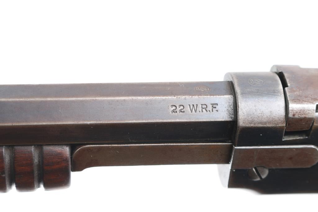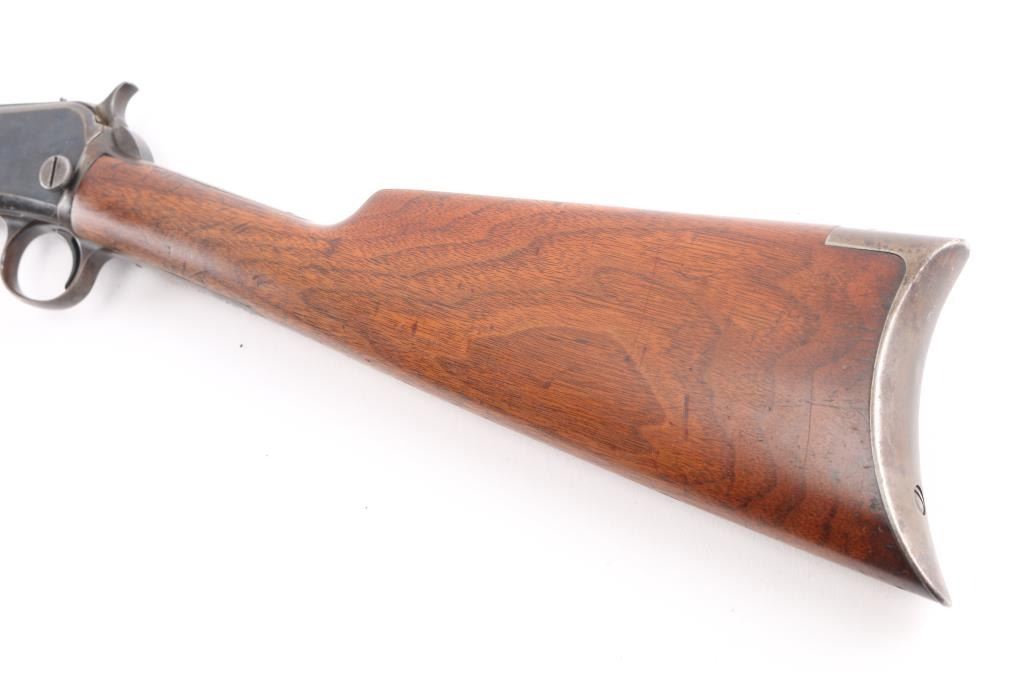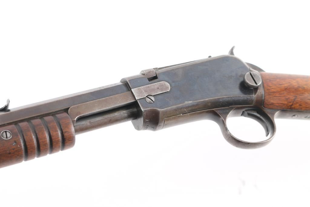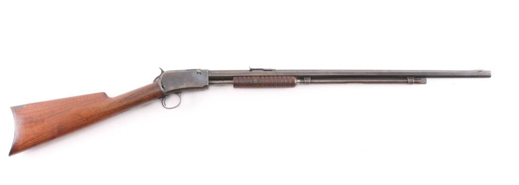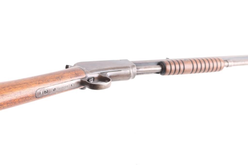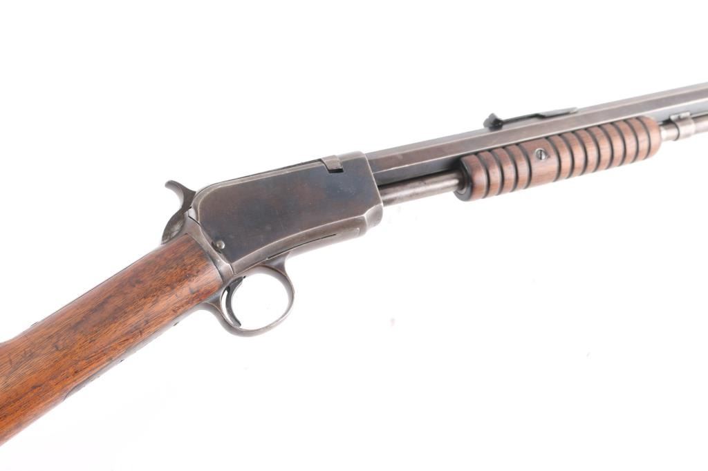 Vintage take-down pump action rimfire rifle manufactured circa 1909. Features blued finish, grooved walnut pump handle, smooth walnut shoulder stock with straight grip area, steel crescent buttplate, 24" octagon barrel, blade front sight, adjustable rear sight, 2/3 length magazine tube under barrel, external hammer, take down screw in receiver. Bore is fair, bright overall, some pitting. Retains 60% blued finish, turning brown on mag tube, bolt, rubbed to bare metal on tangs where handled and on moving parts, edge losses, scratches on receiver. Wood is very good condition, varnished, minor scratches/dings. Action is smooth. Markings are sharp.