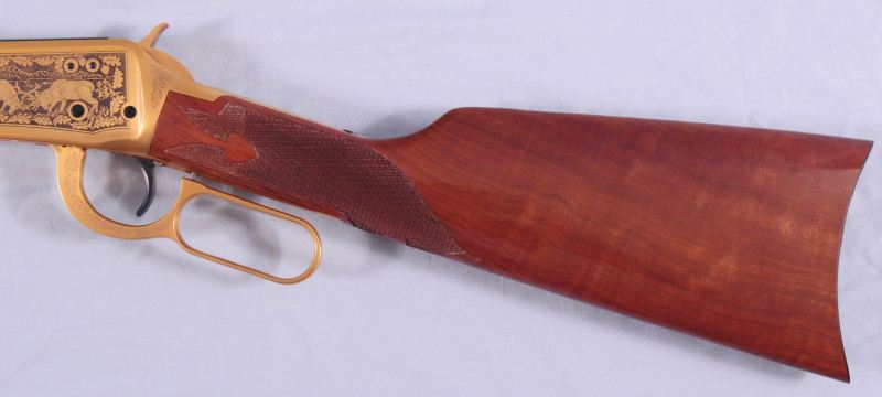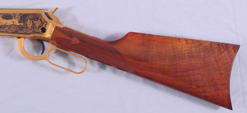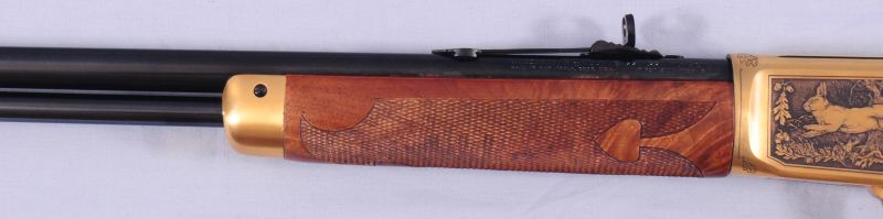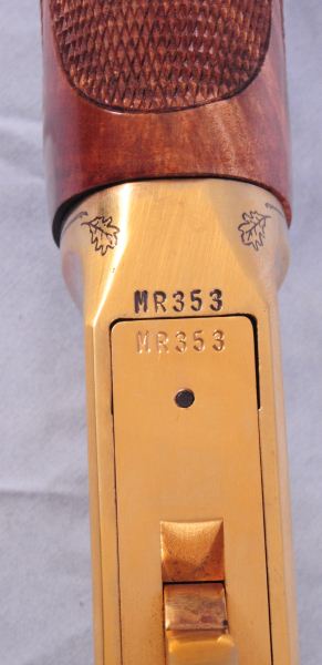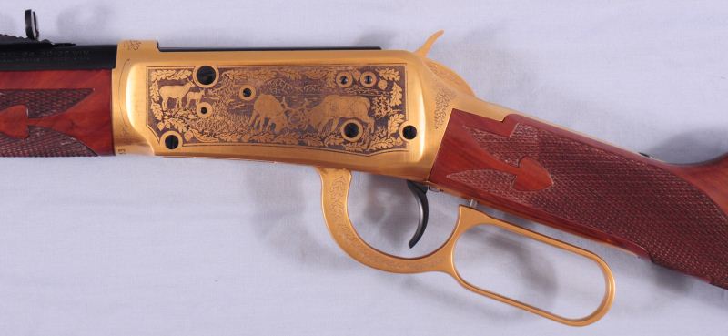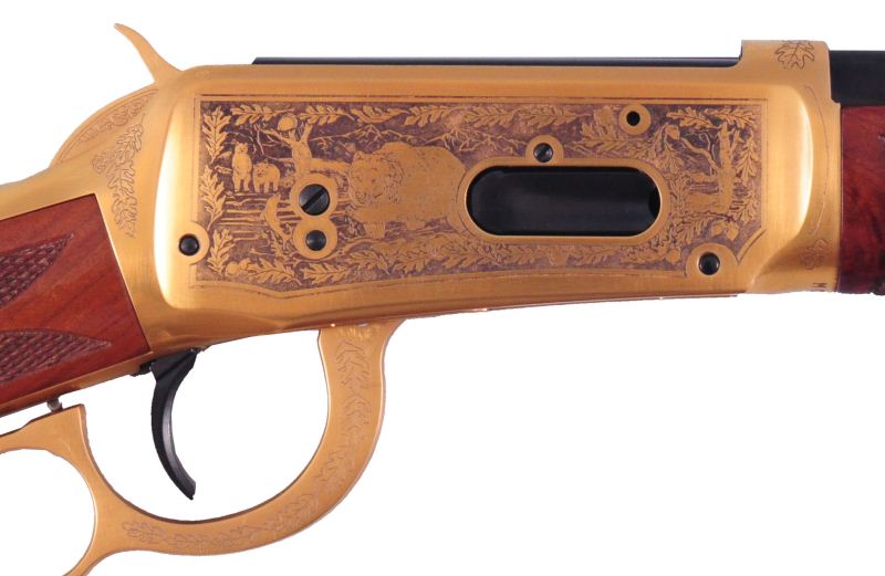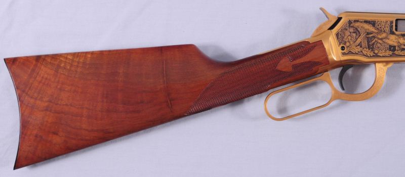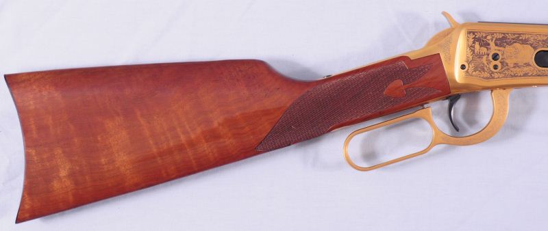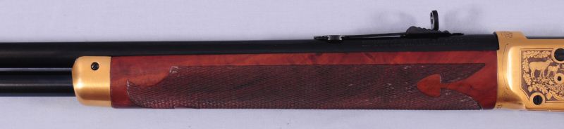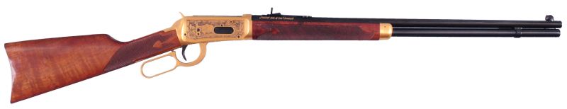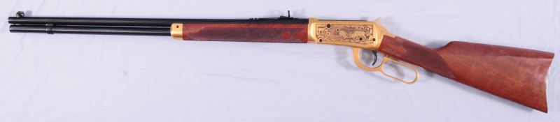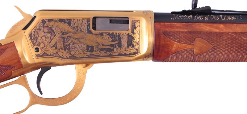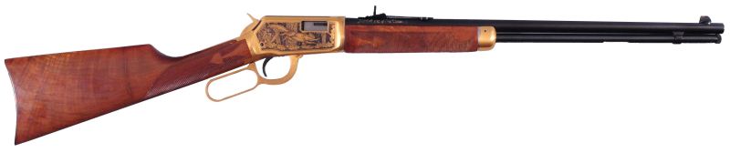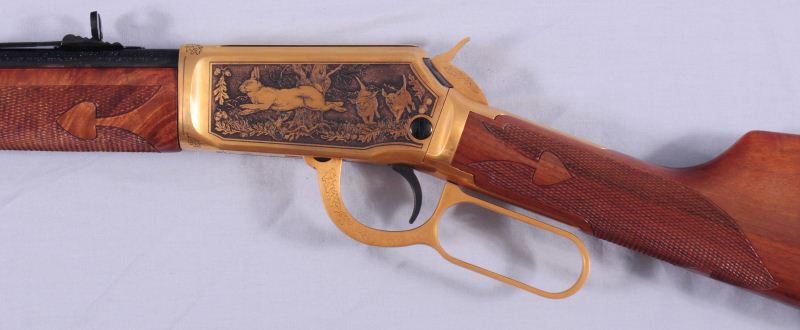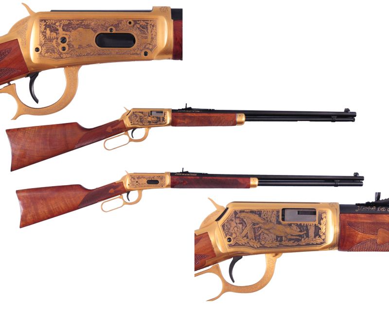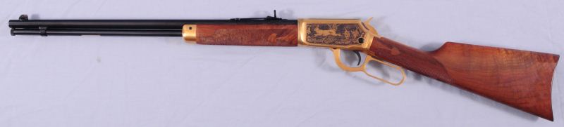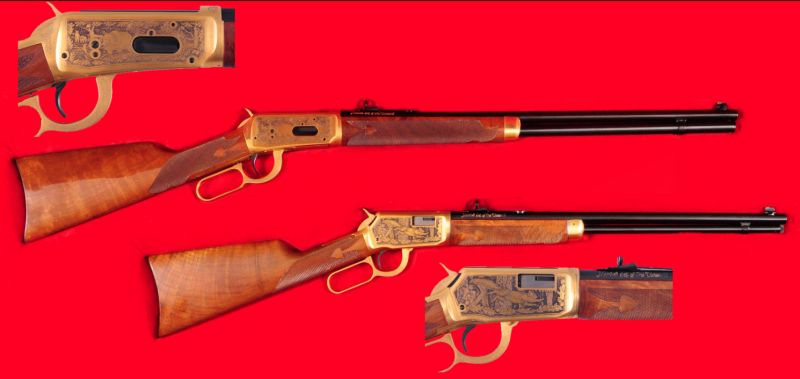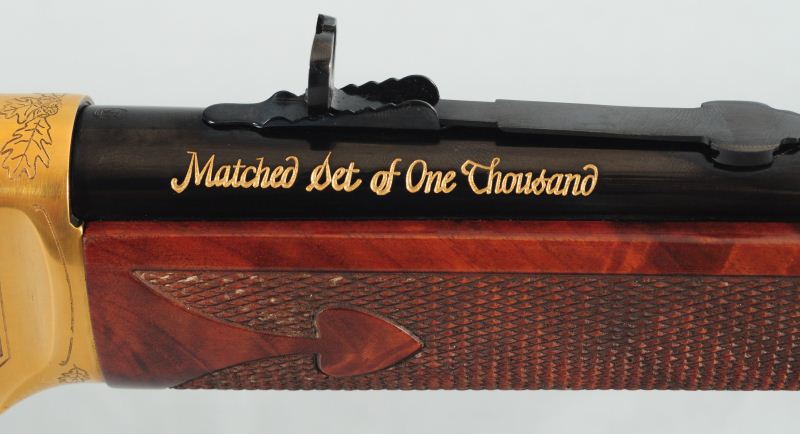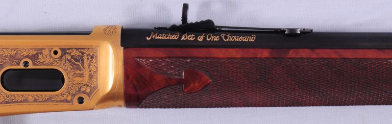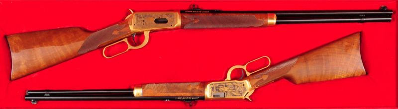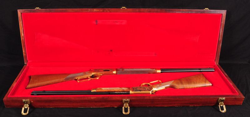 Winchester Matched Set of One Thousand Engraved Guns. The Set Consists of .30-30 Carbine and a .22 Magnum Rifle. Each is Deeply Engraved (Nimsche pattern) Matte Gold Plated Receiver and Barrel Bands, High Polish Blue, XXX Wood, with Original Walnut Presentation Case Holding Both Guns. Ser# .22 is MR353. Ser# .30-30 is MC353.