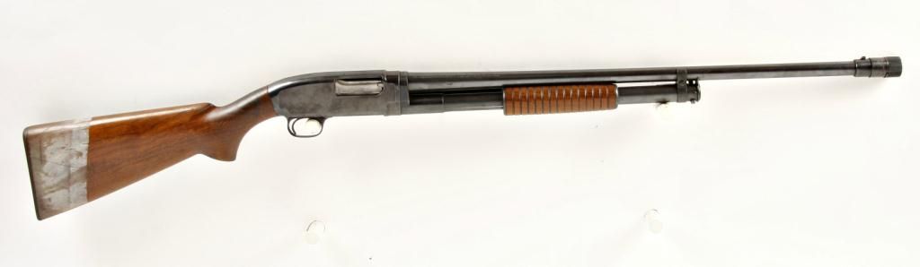Winchester Mdl 12 16 ga SN:831363Pump action takedown shotgun, blued finish with plain pistol grip walnut stock and grooved pump handle, barrel is 26" with the installed poly choke, good bore and action. Condition: Good with light scratching fromlight use, stock has a white stain from butt to 3" up stock, will clean up.