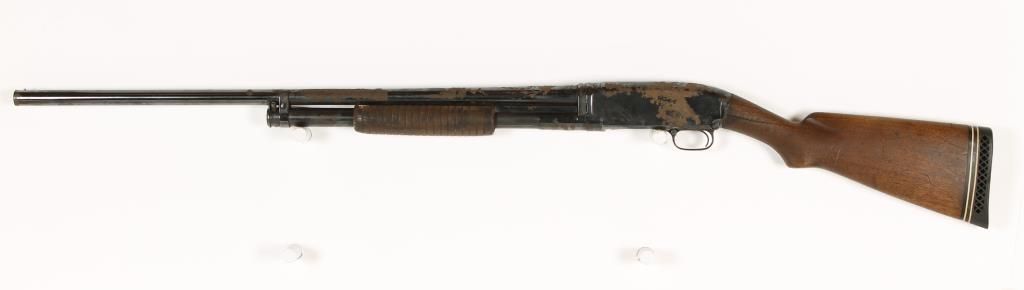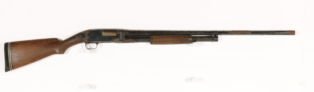 Pump action take down shotgun with 30" plain barrel with screw in choke made in 1927. Blued finish, plain pistol grip walnut stock, grooved pump handle and rubber recoil pad. Good bore and action is stiff. Condition: Poor as heavy pitting present on 20% of receiver and barrel and wood show small losses and cracked near wrist.