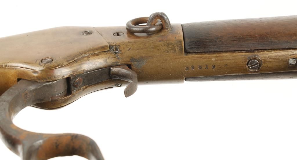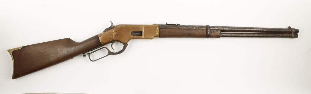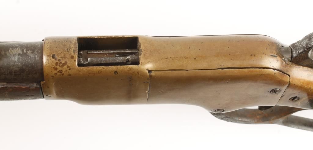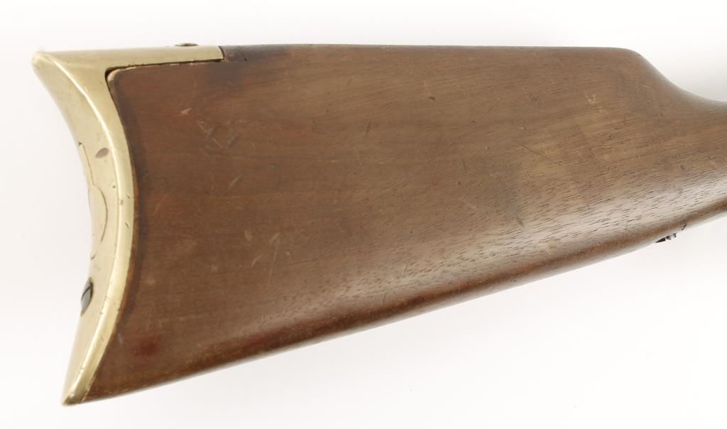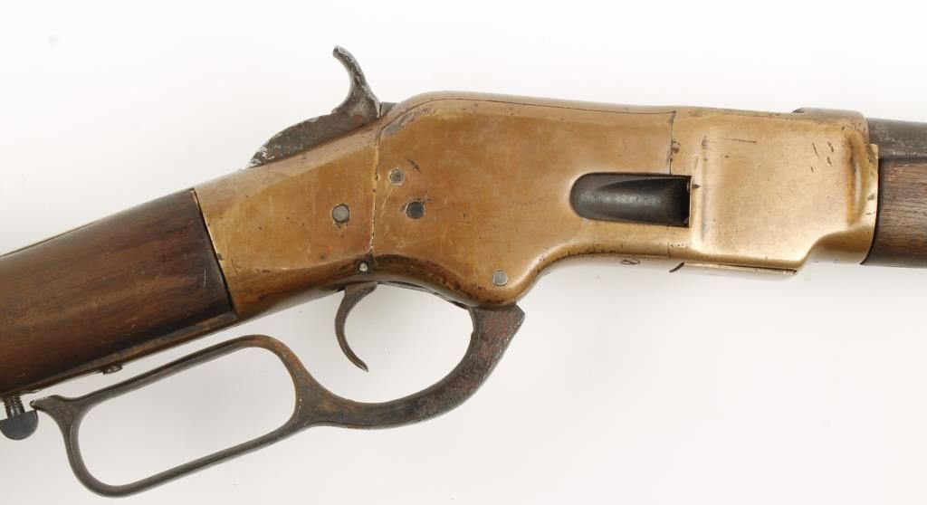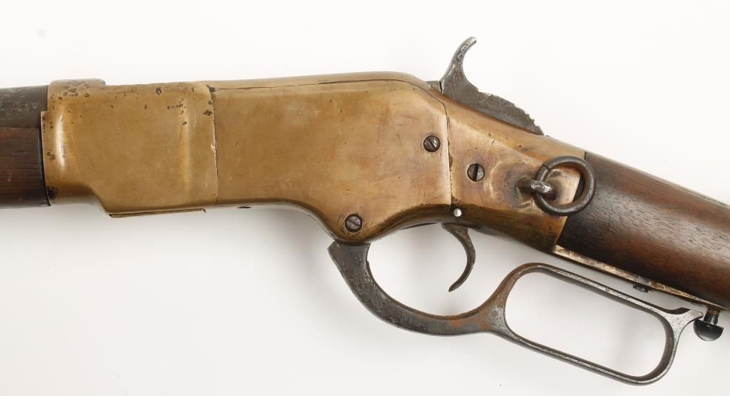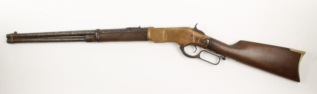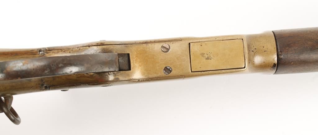 Lever action third model carbine made in 1870 with 20" round barrel. Brass frame and crescent butt plate, plain straight grip walnut stock and forearm, saddle ring, full length tube magazine and flip up rear leaf sight. Relic Frontier condition. These "Yellow Boys" have dried up.