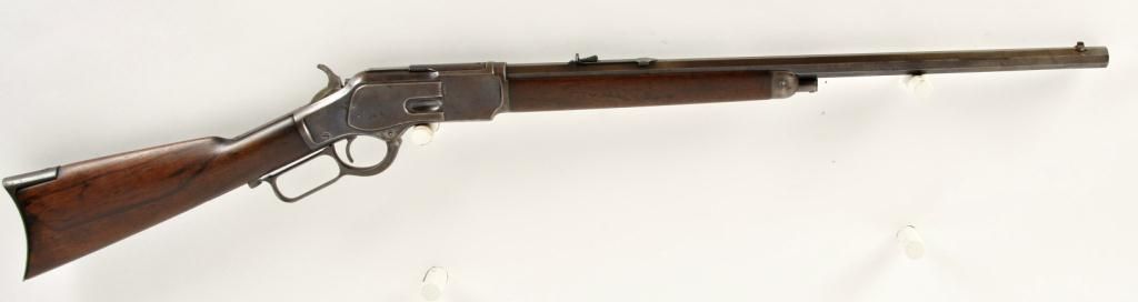Winchester Mdl 1873 Cal .32/20 SN:236218BLever action rifle, blued finish, wood stock and forearm, 22" barrel, short magazine, fair bore but will clean, Marble #5 front sight and adjustable rear, barrel has been cut down as has the magazine, stock has beenresurfaced and is smaller than the butt plate, some of the screw have been buggered, and dust cover has been replaced. Condition: Good to very good overall as modified.