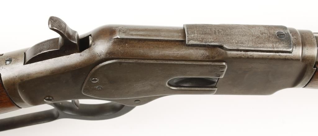 Lever action third model sporting rifle made in 1892 with 24" octagon barrel. Blued finish, plain straight grip walnut stock, capped forearm, full length tube magazine and crescent butt plate. Very good bore and good action. Condition: Good overall showing small amounts of original finish with a brown patina and wood is very good.